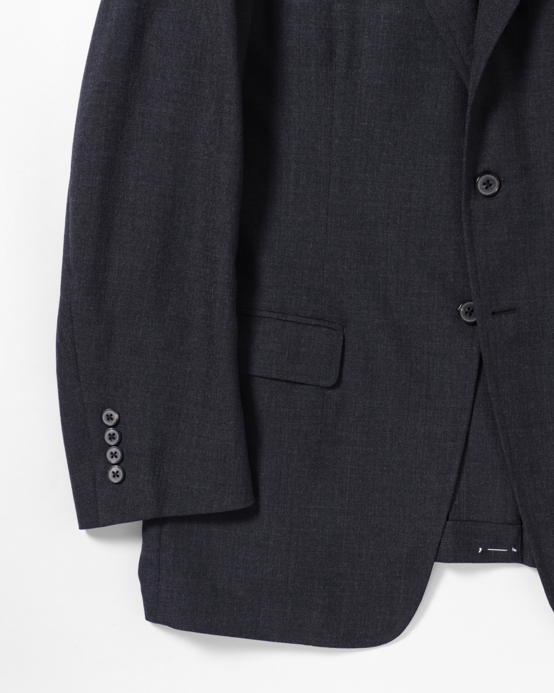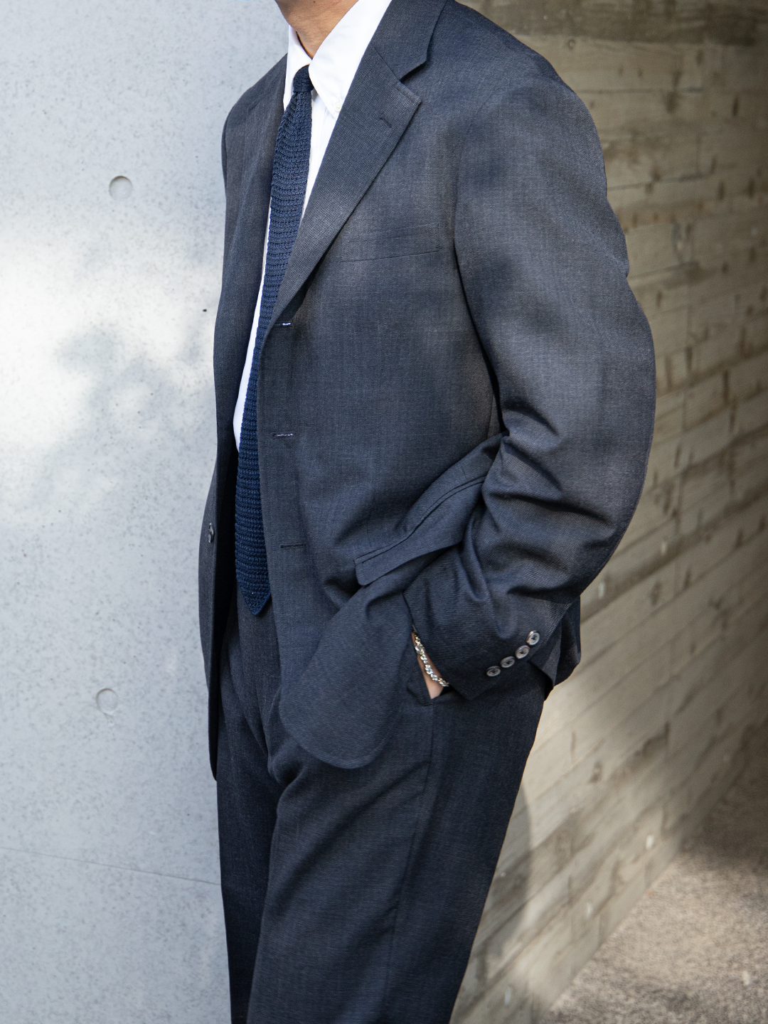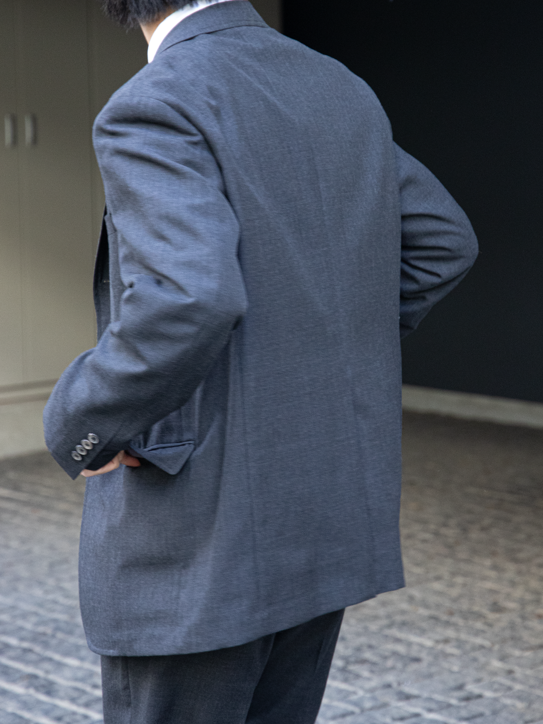 基本的なディティールとして、ジャケットは3つボタン段返り。袖は4つボタン。バックはセンターベント。