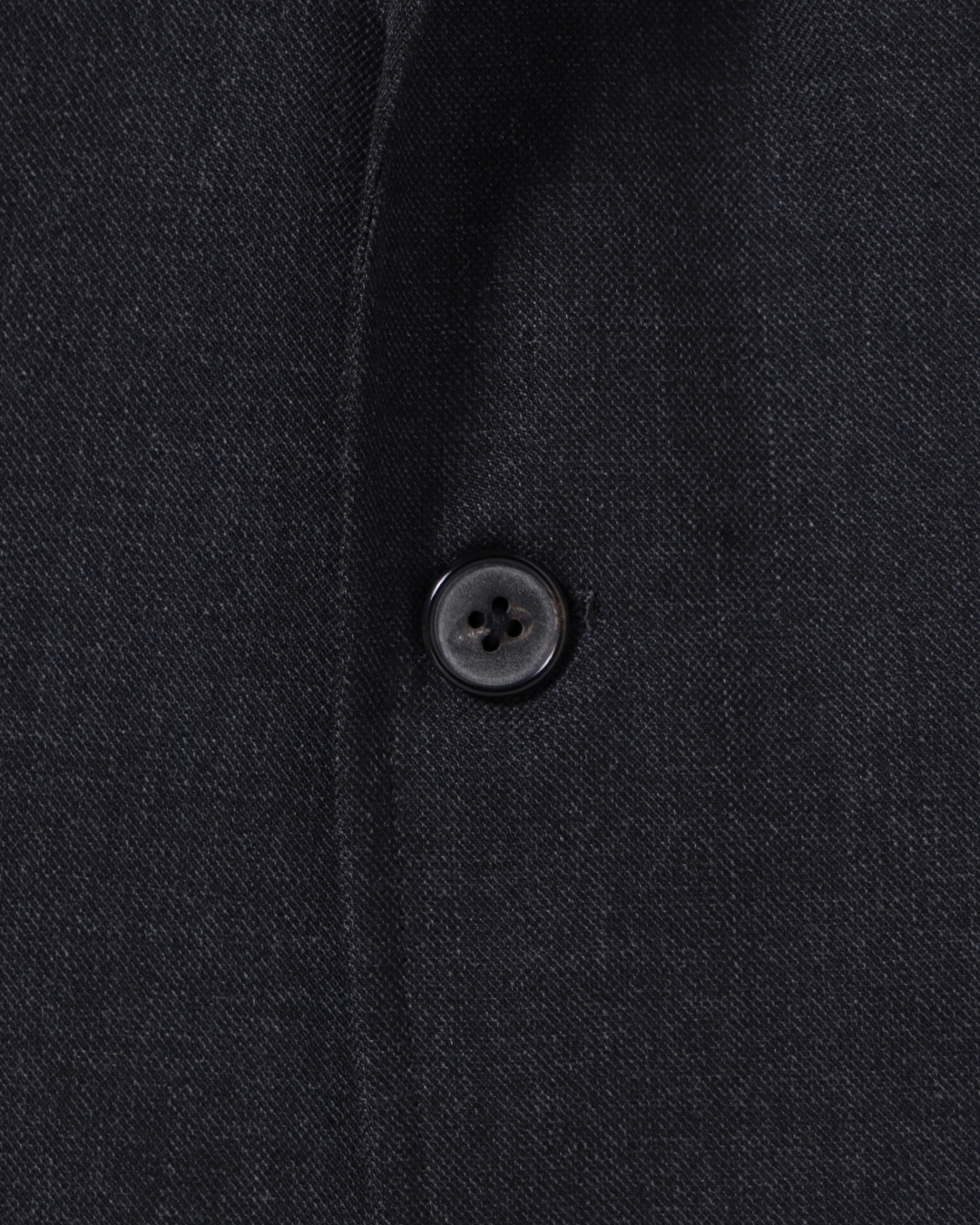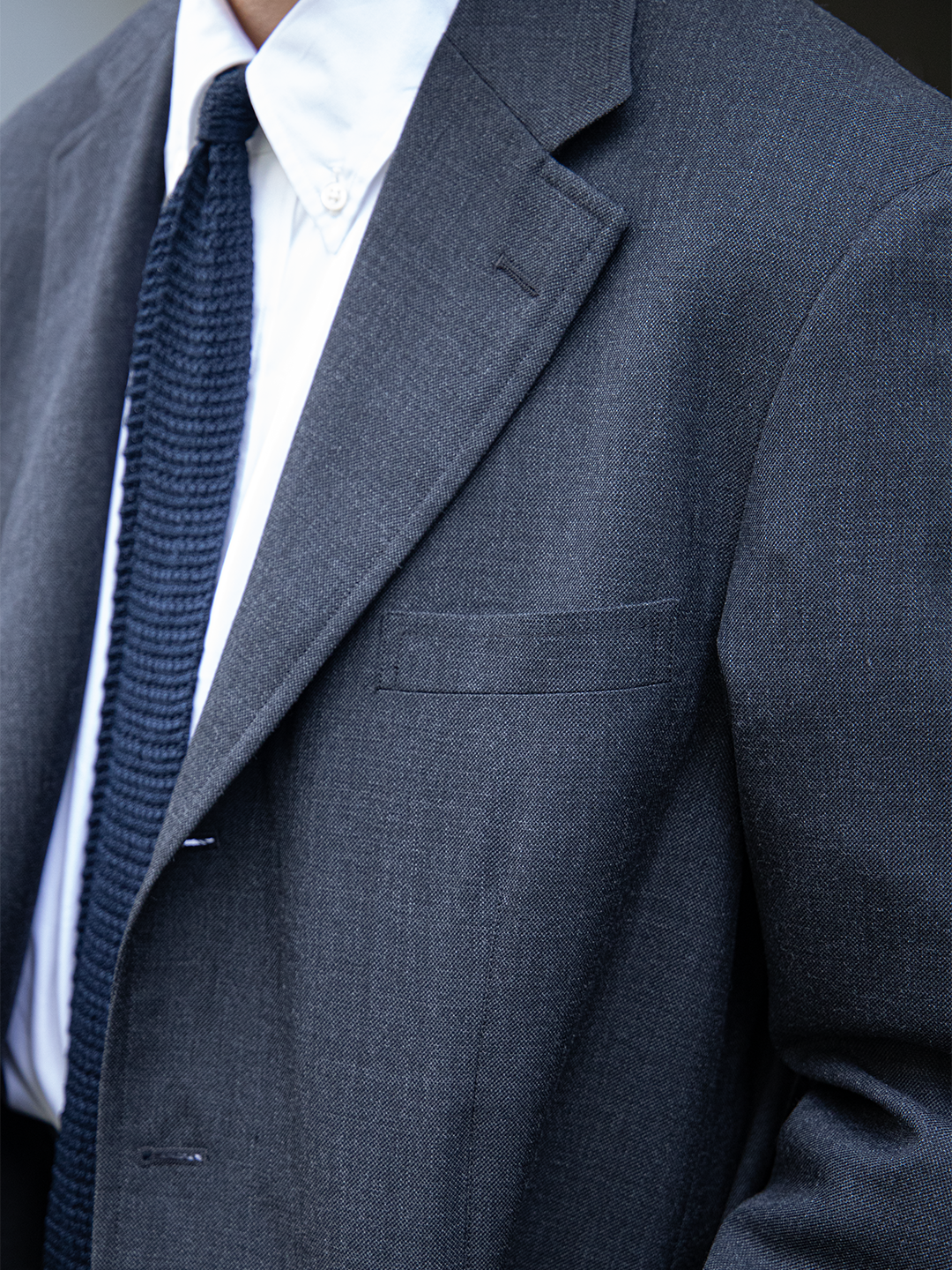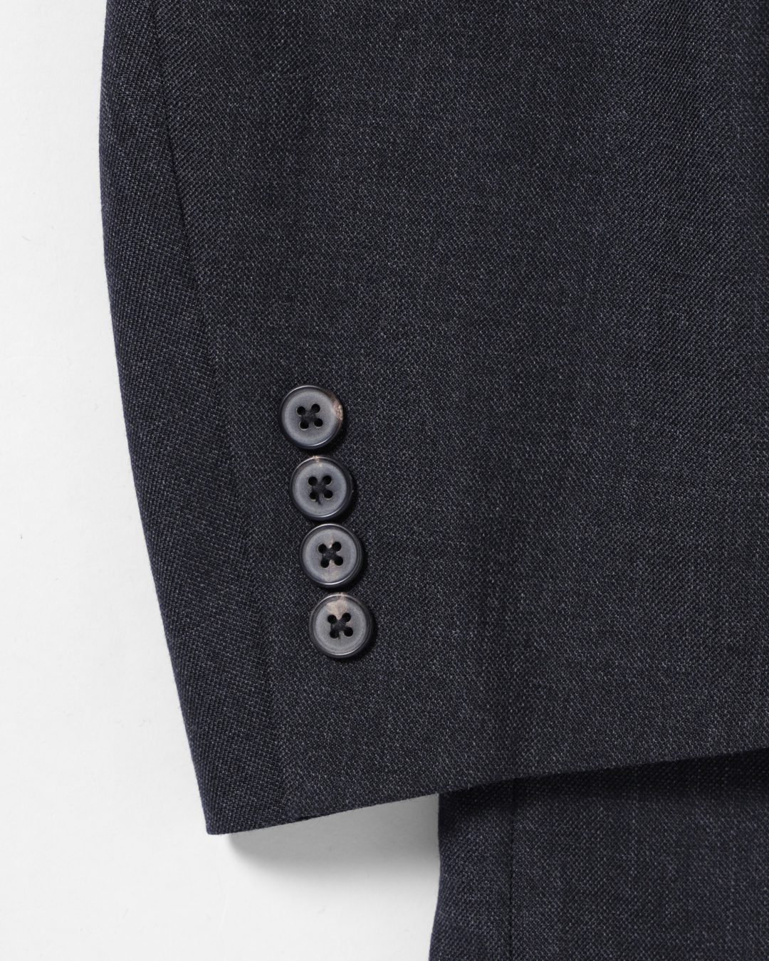 基本的なディティールとして、ジャケットは3つボタン段返り。袖は4つボタン。バックはセンターベント。