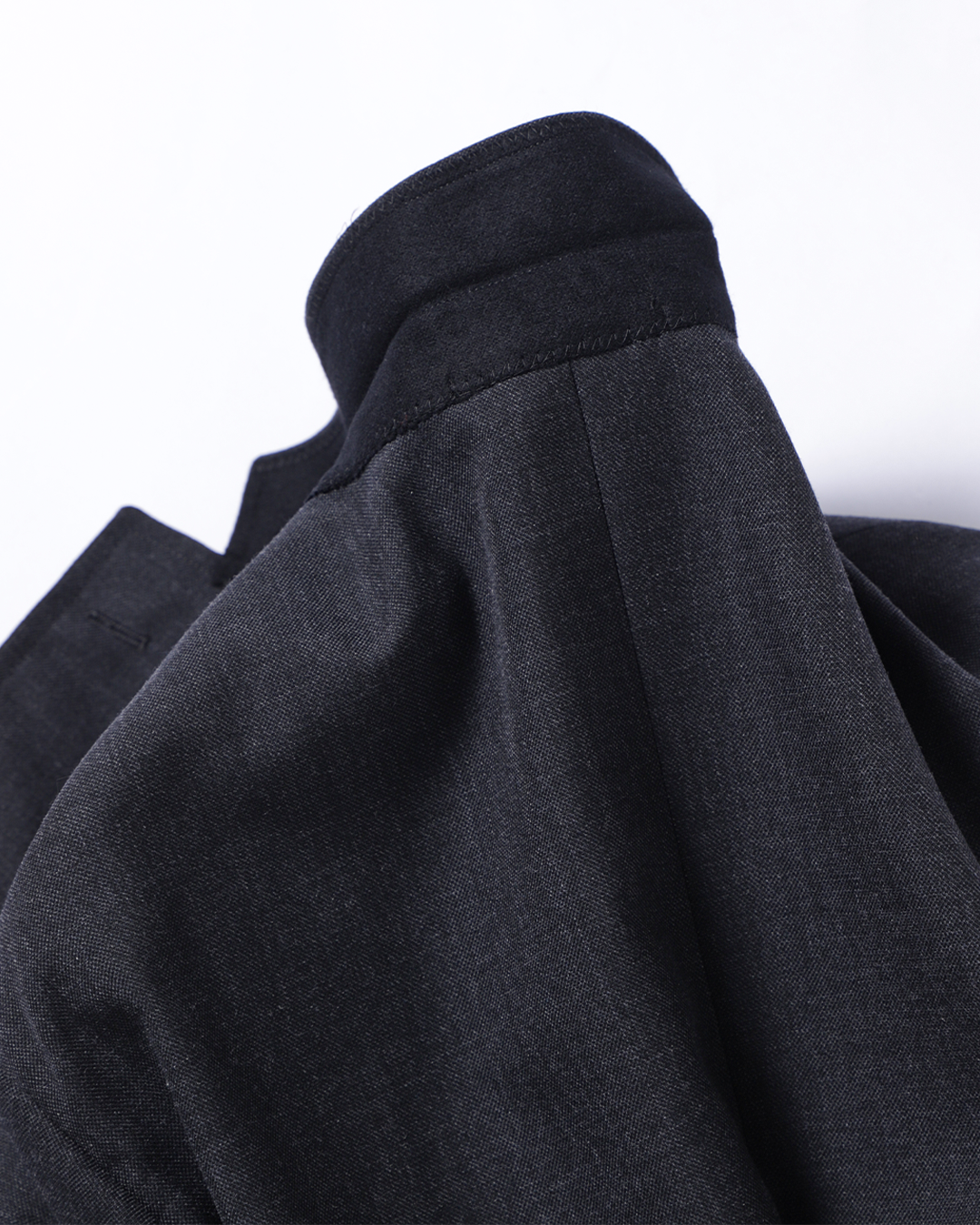 アジア人のコンパクトな肩回りに上品さを与えるナチュラルなショルダーラインと首に吸い付くような襟の立具合いになるよう何度もパターン調整を重ねました。