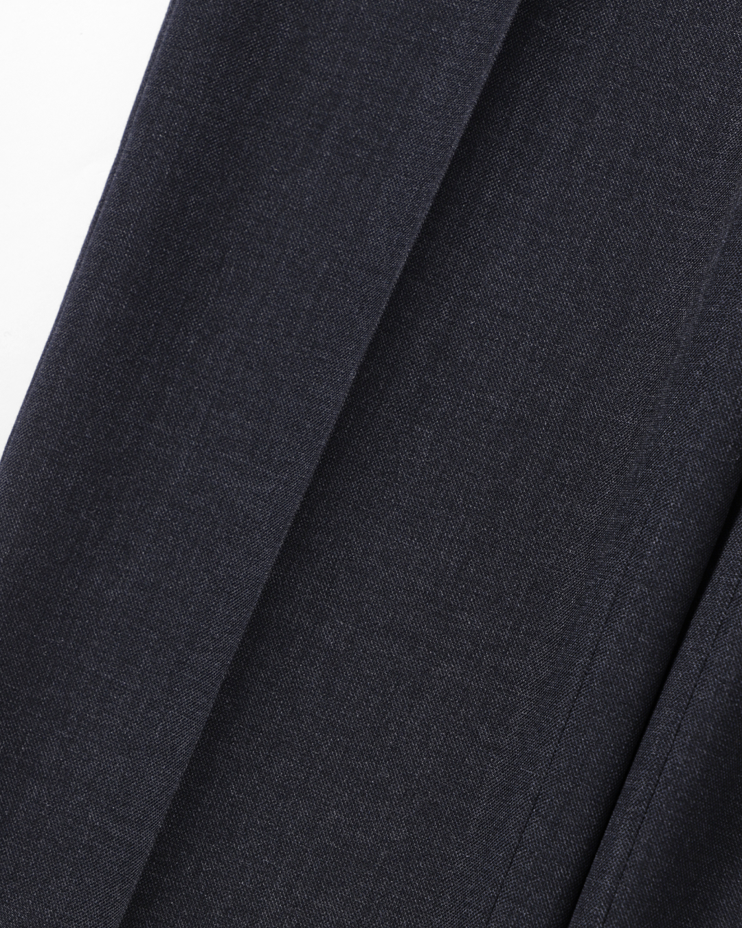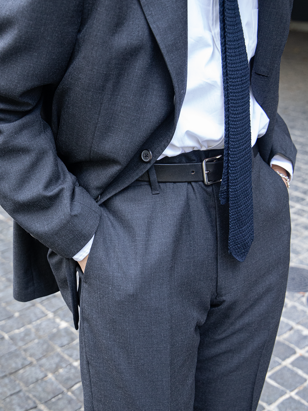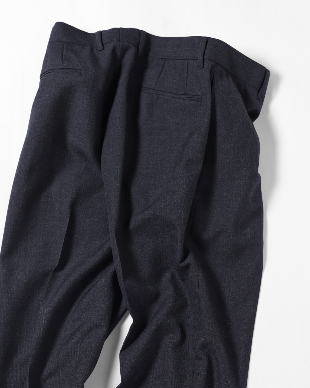 ラペルは従来のスーツよりも若干ワイドに設定されており、余裕のある雰囲気を醸し出します。パンツはノータックでストレートシルエット。