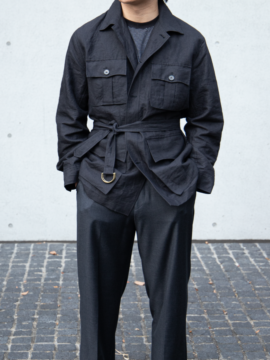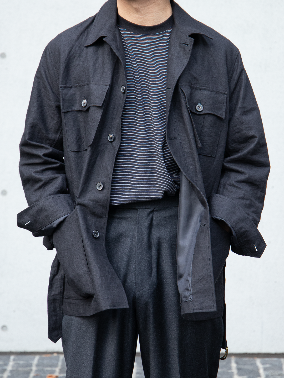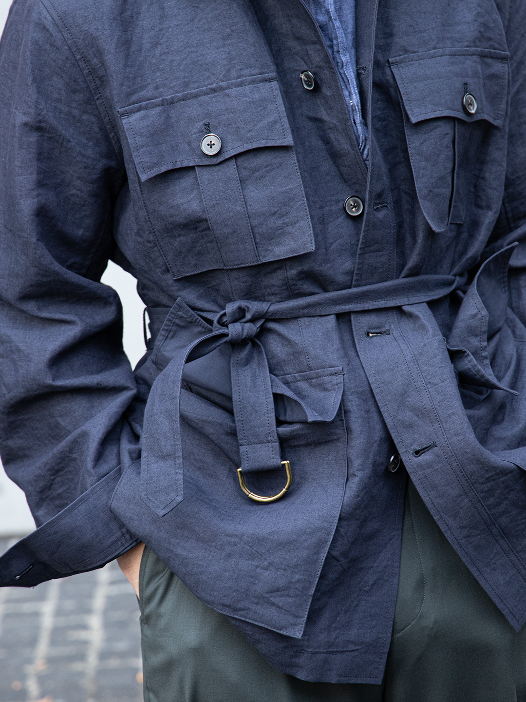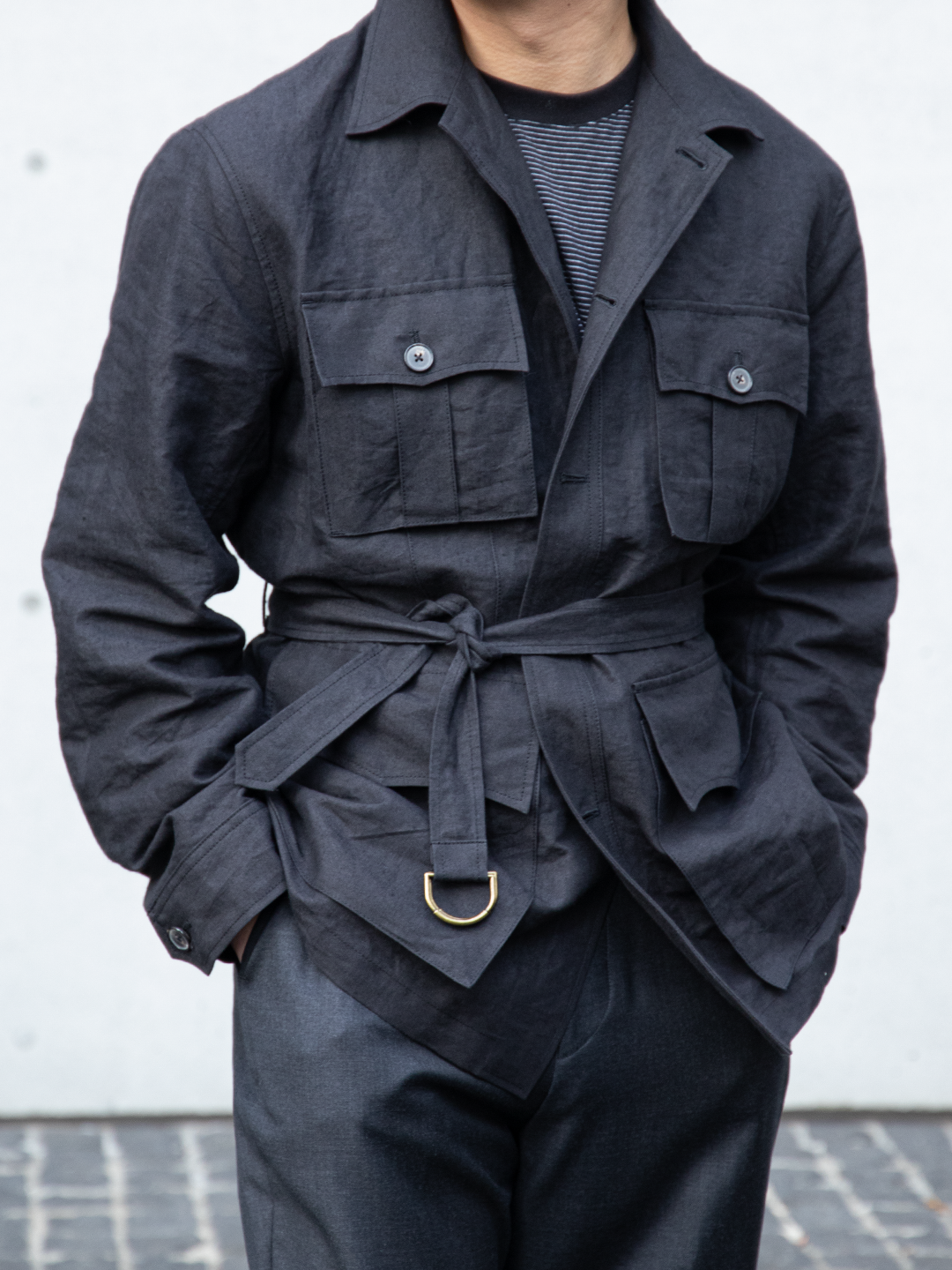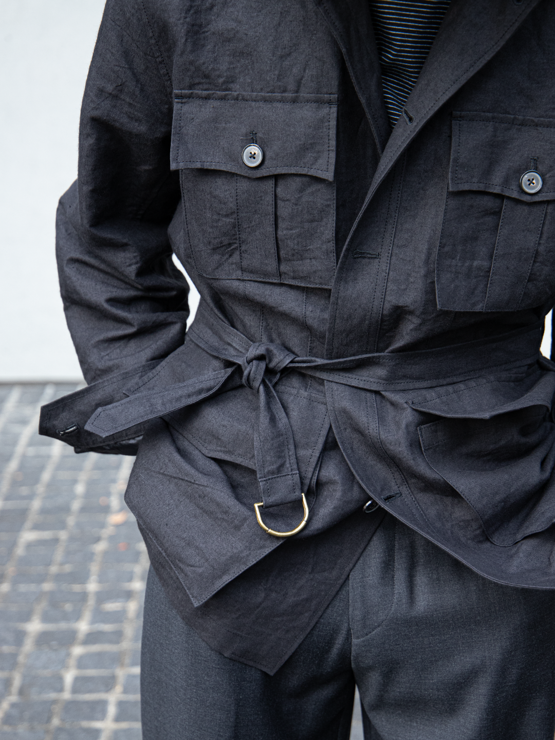 ウエストベルトは結ぶ、垂らす、あるいはポケットに収めるなど、着る人の感覚で自由に扱える設計です。
