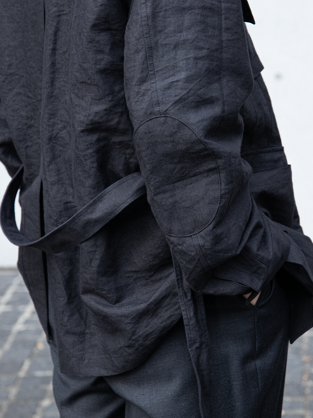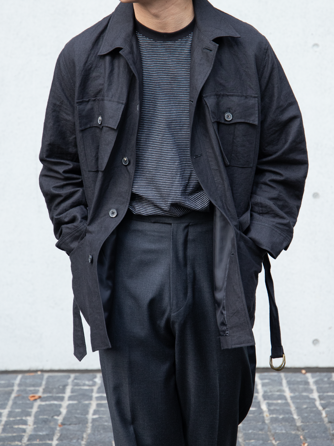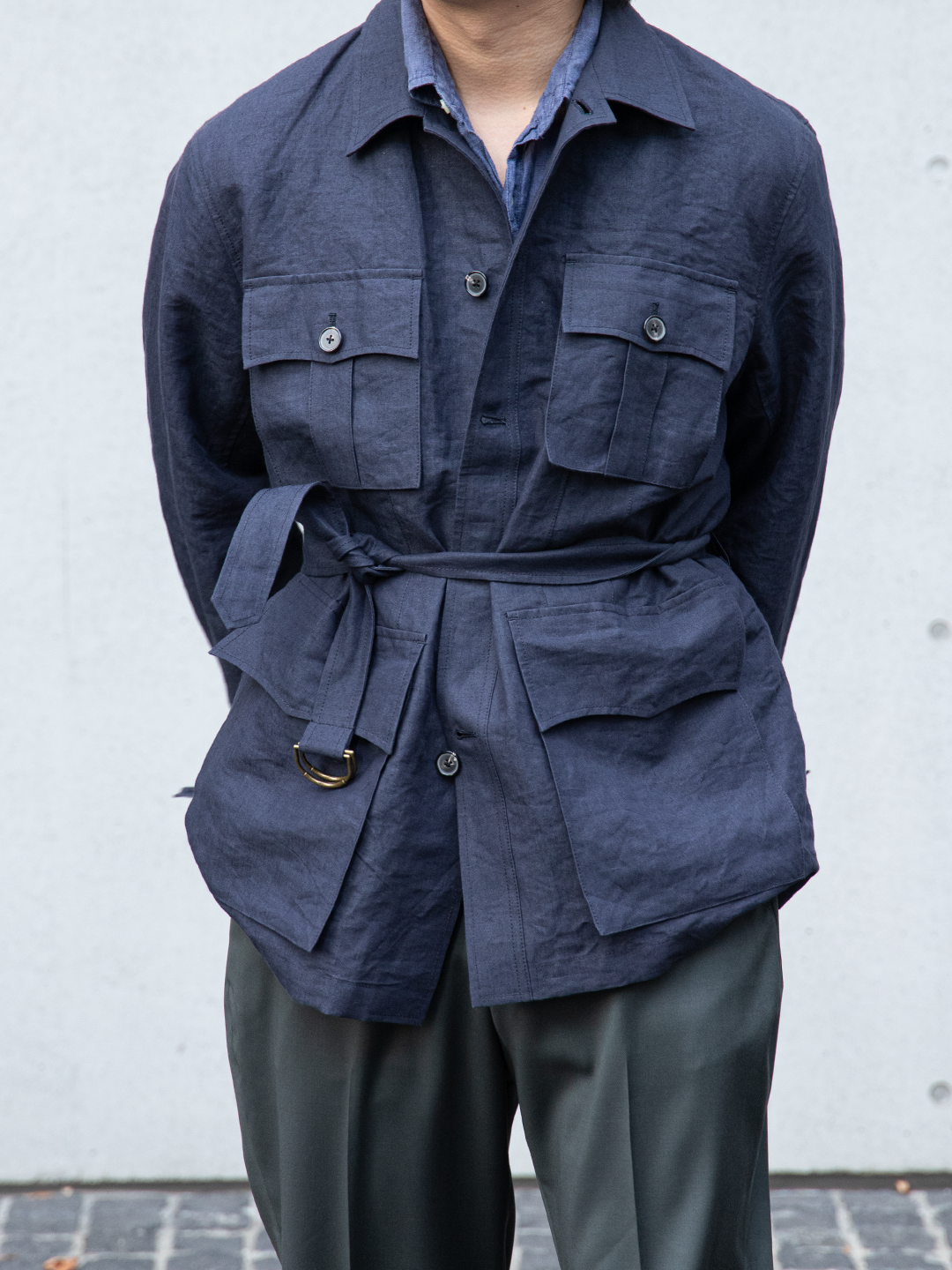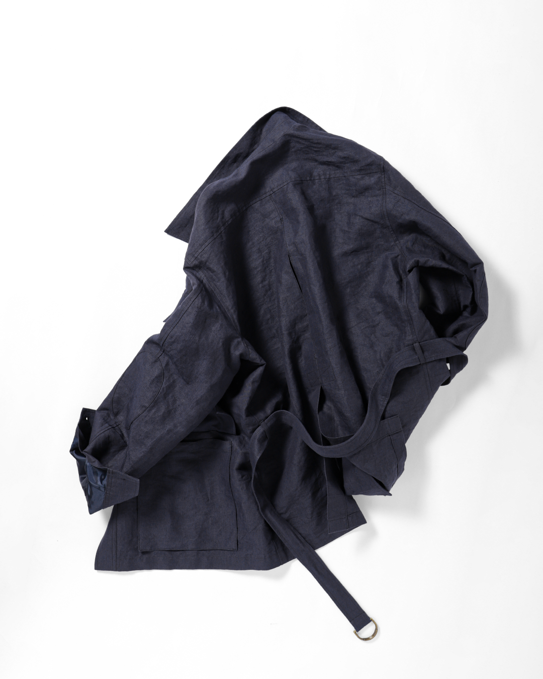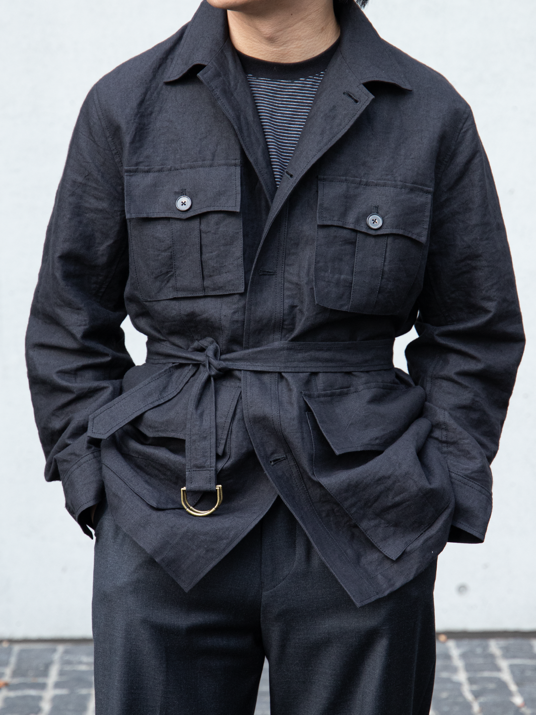 ウエストベルトは結ぶ、垂らす、あるいはポケットに収めるなど、着る人の感覚で自由に扱える設計です。