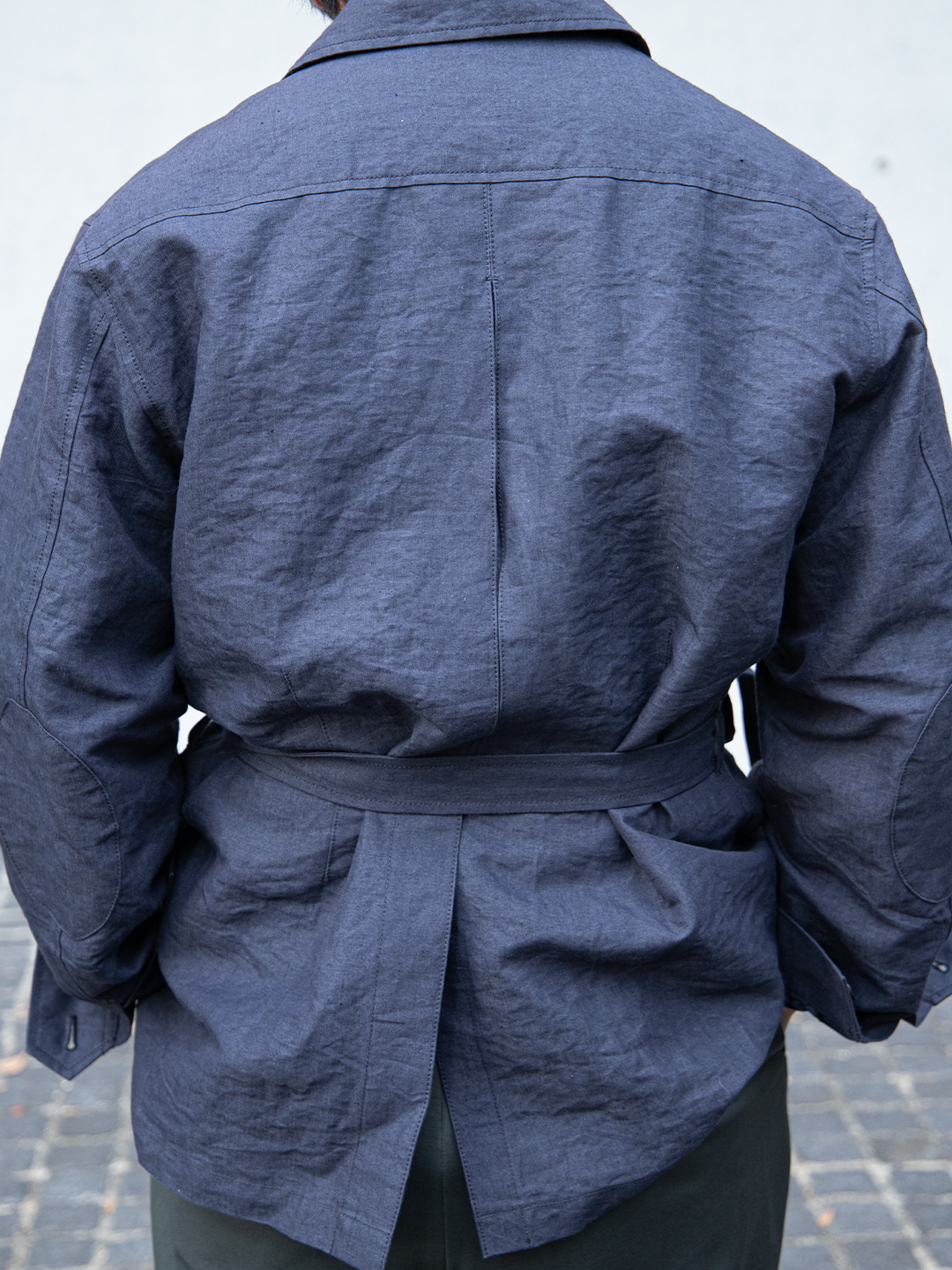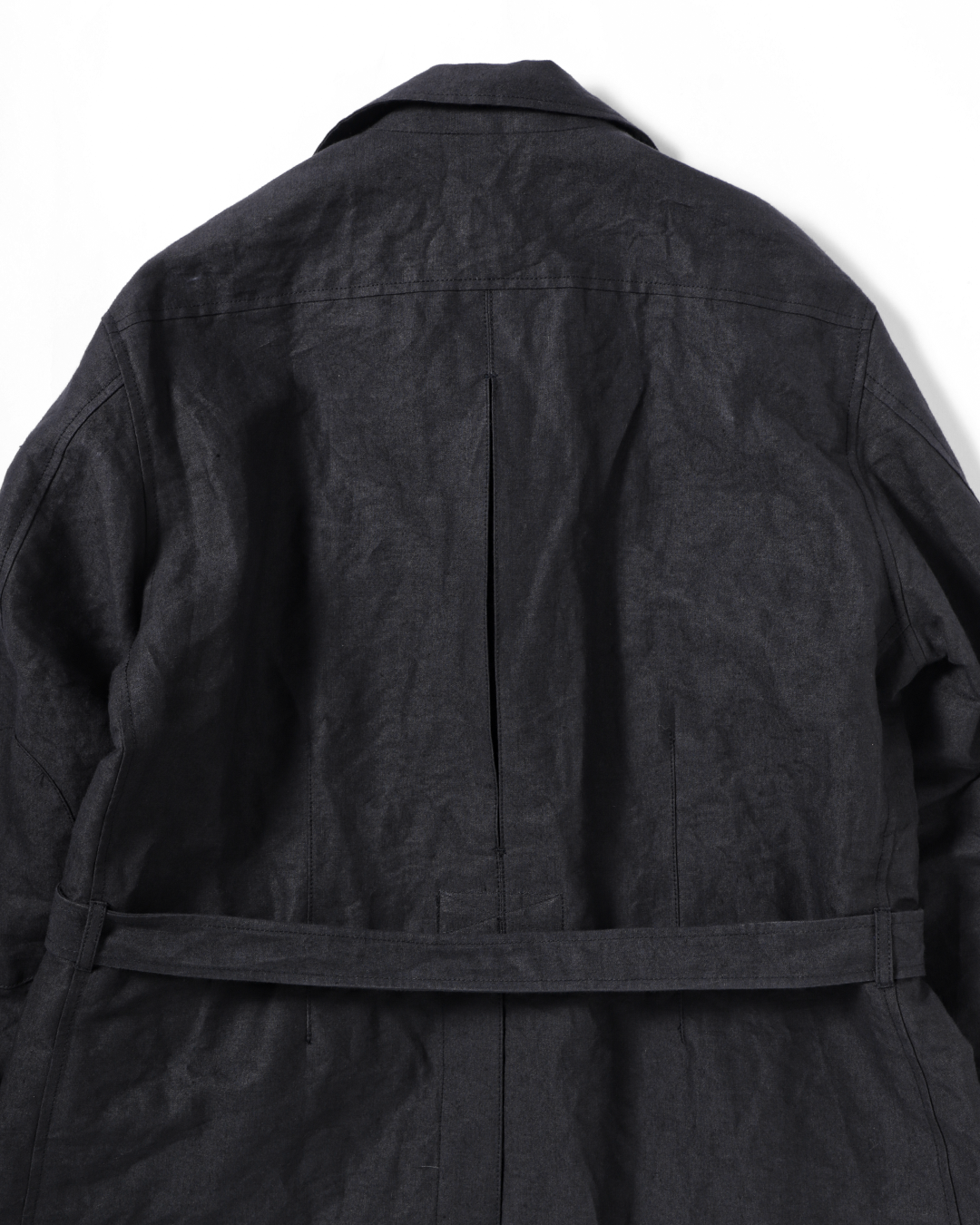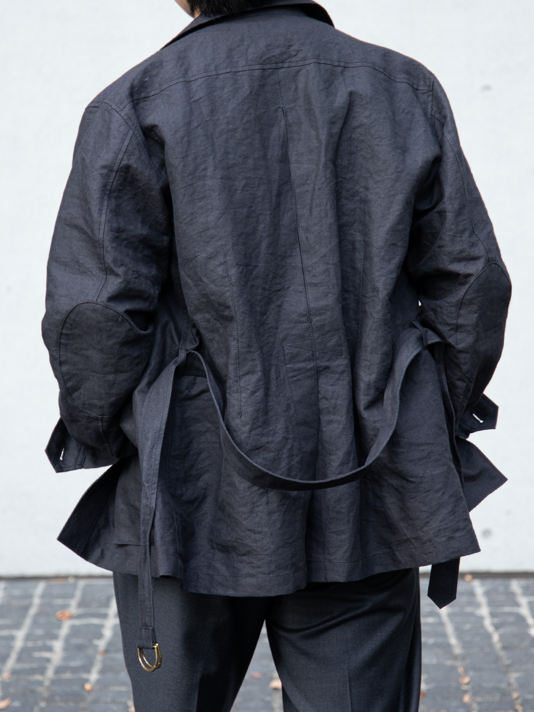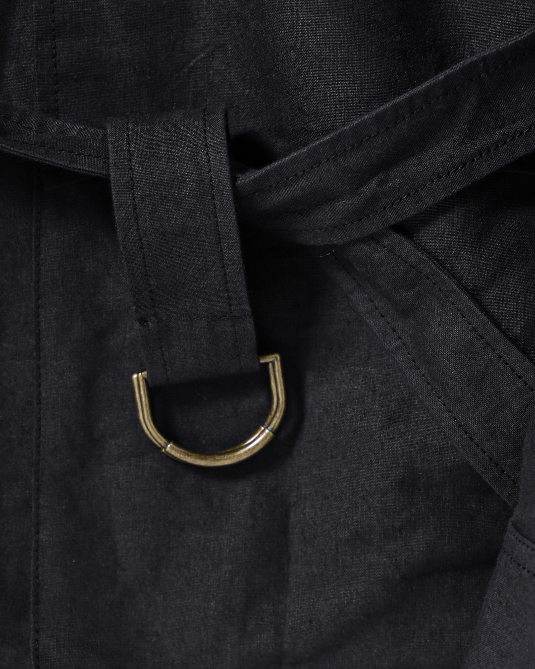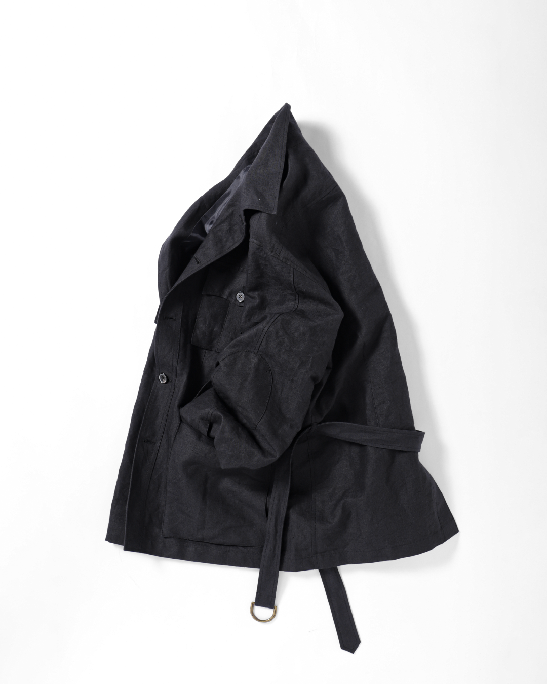 ウエストベルトは結ぶ、垂らす、あるいはポケットに収めるなど、着る人の感覚で自由に扱える設計です。