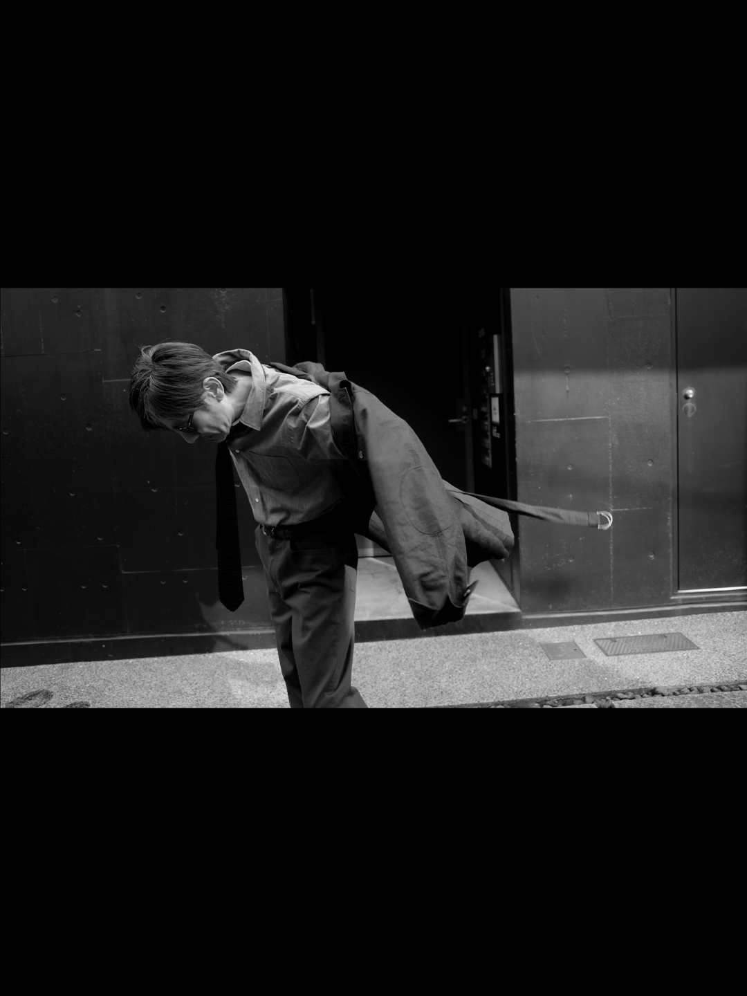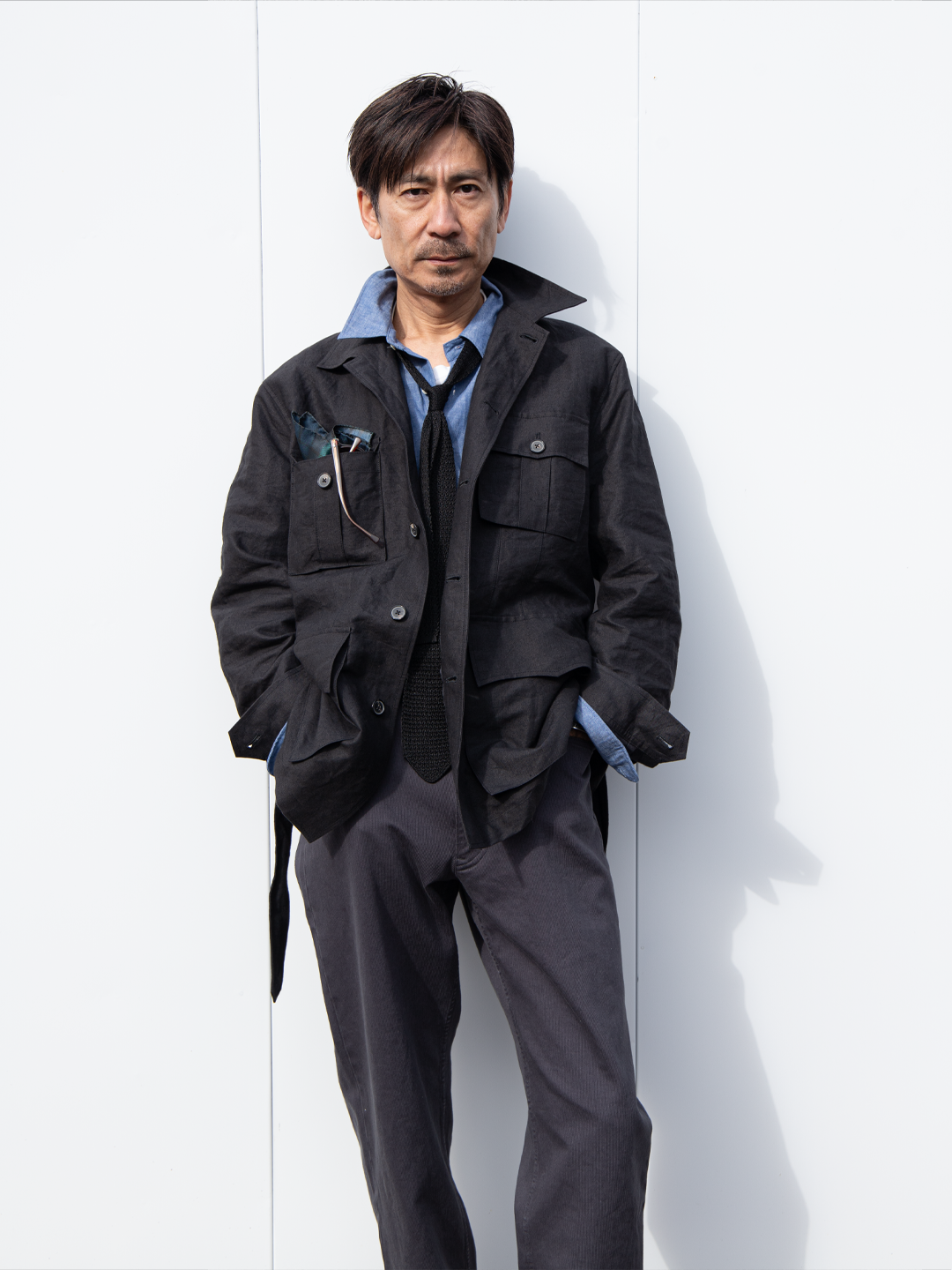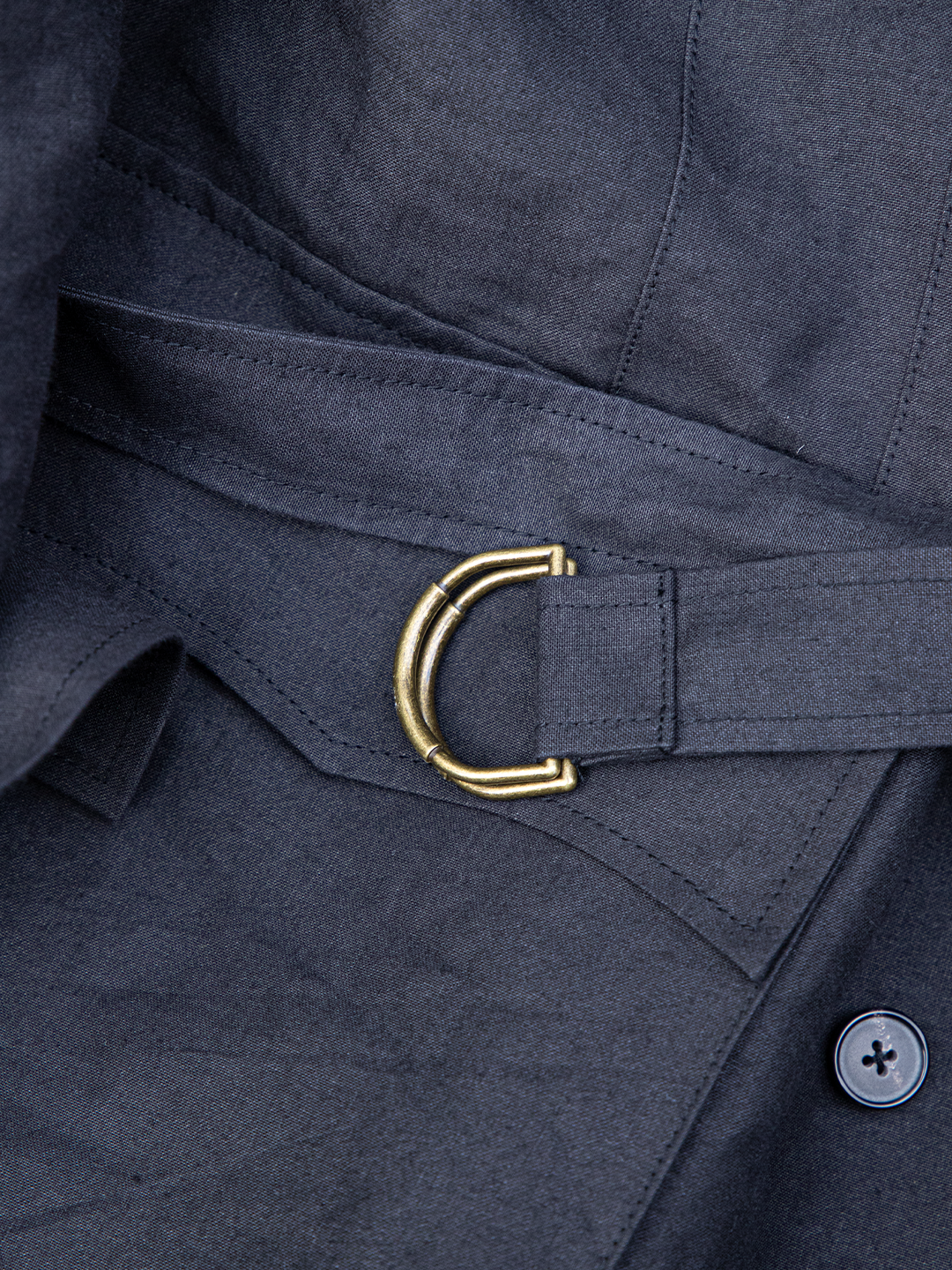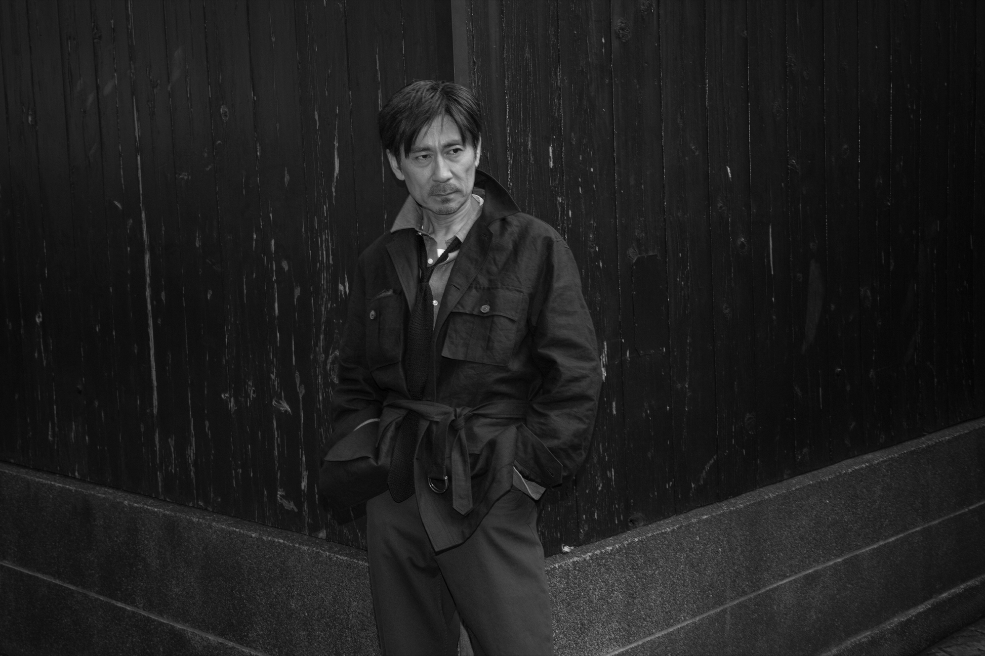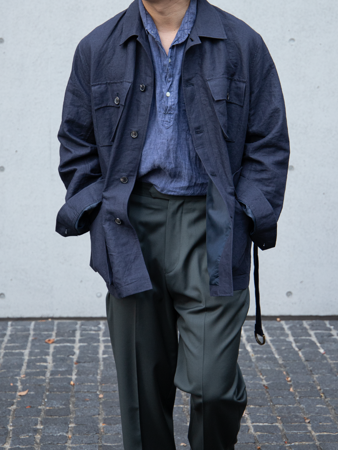 ウエストベルトは結ぶ、垂らす、あるいはポケットに収めるなど、着る人の感覚で自由に扱える設計です。