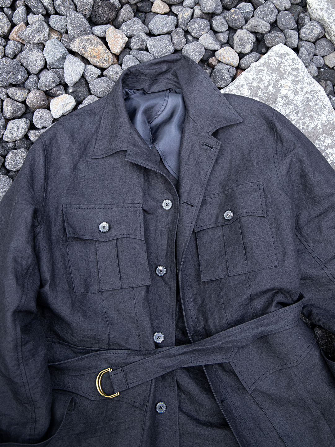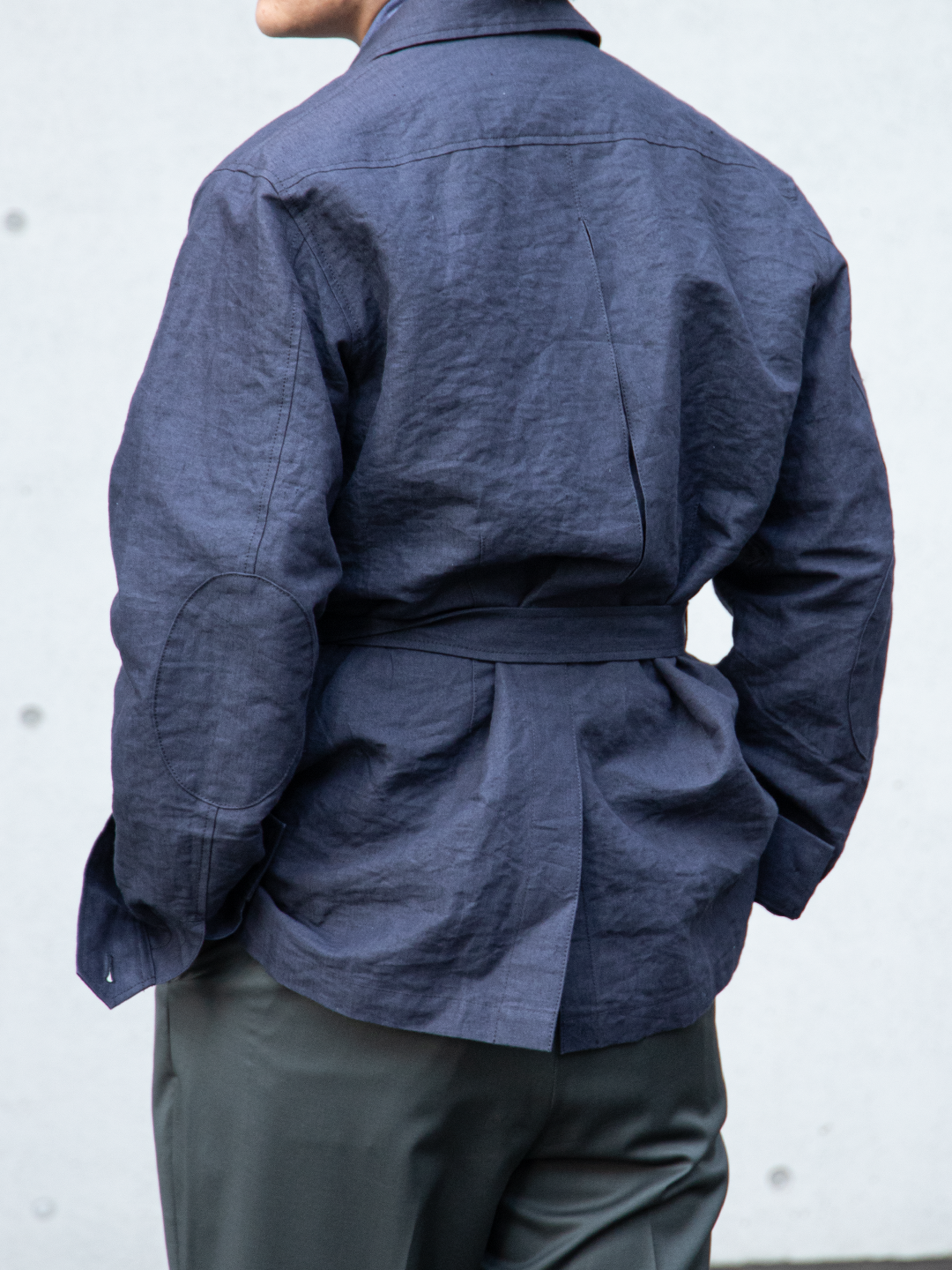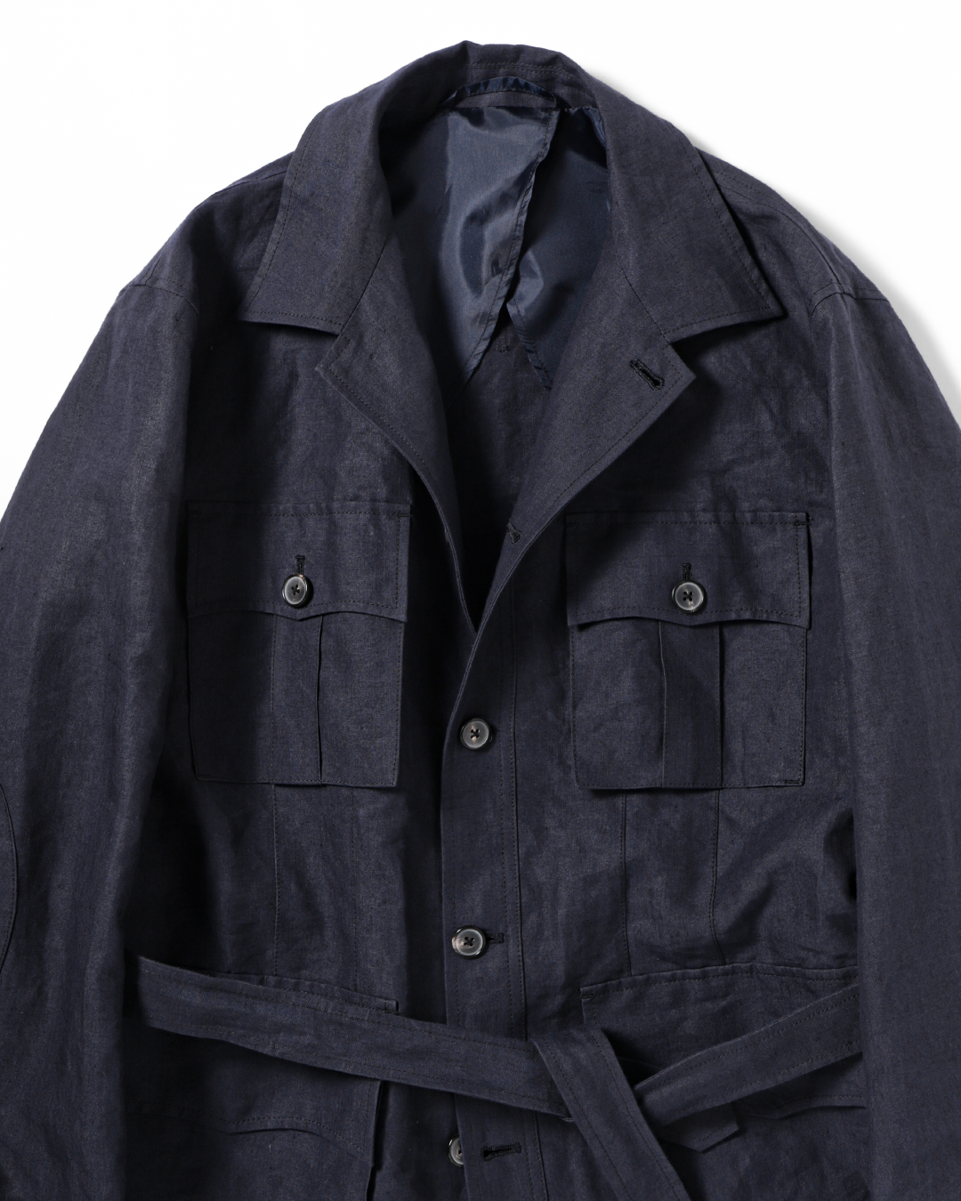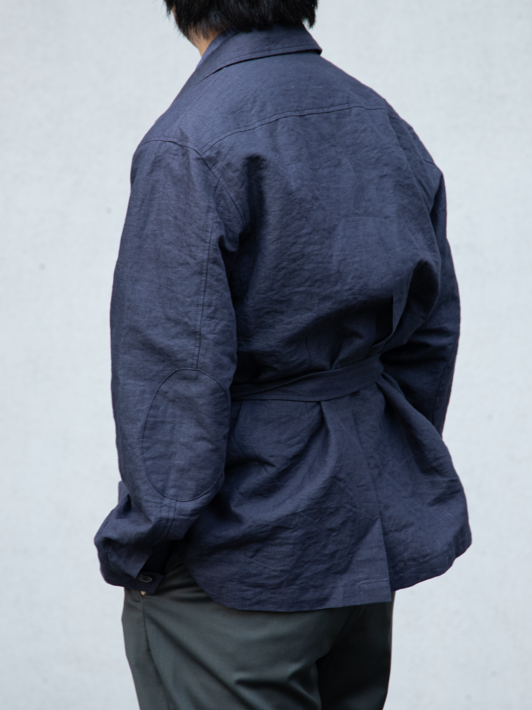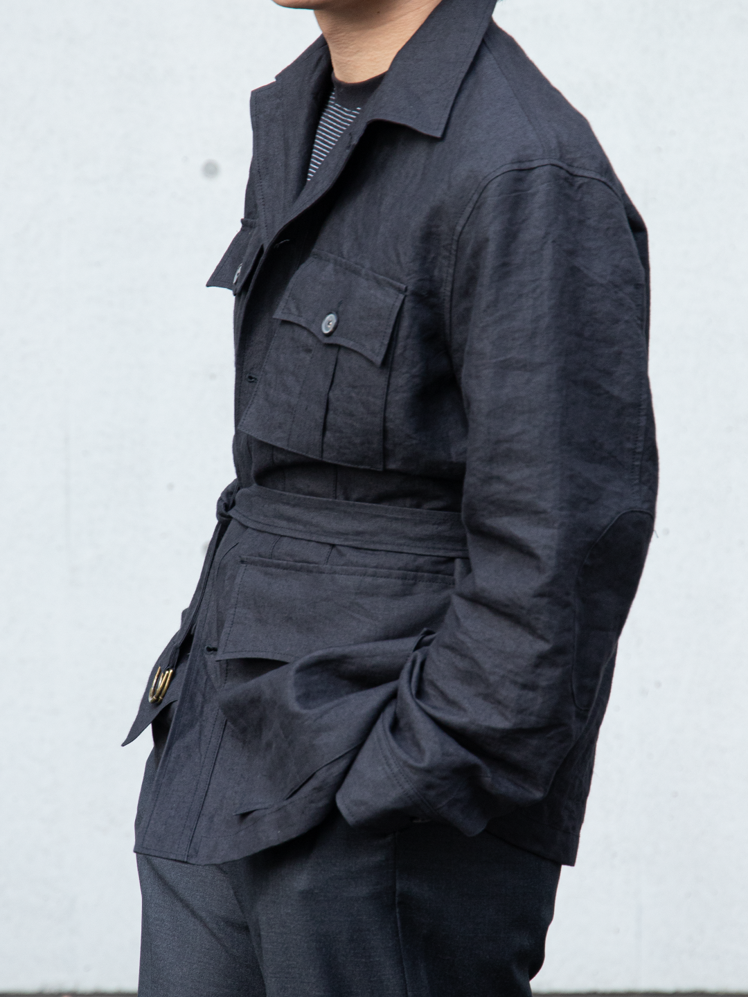 フィールドジャケットの実用性とクロージングメーカーならではのテーラリングの視点を融合させたこのモデルを、和紙とリネンの混紡素材で再構築しました。