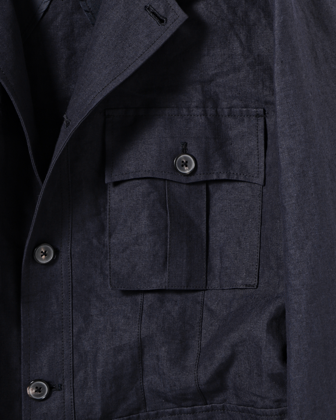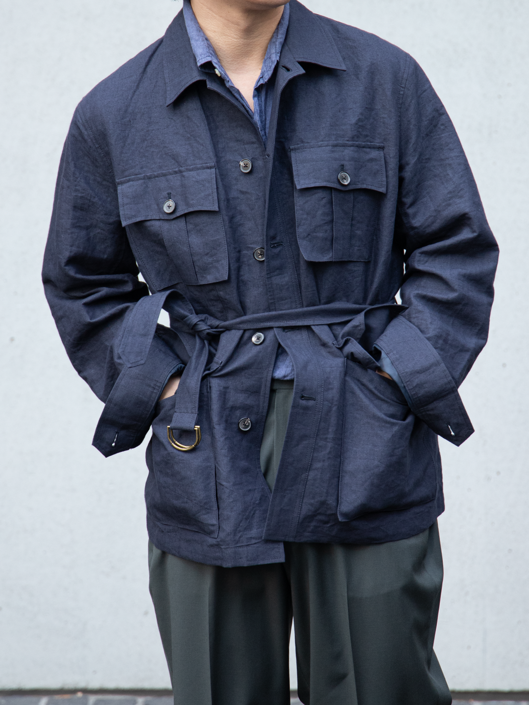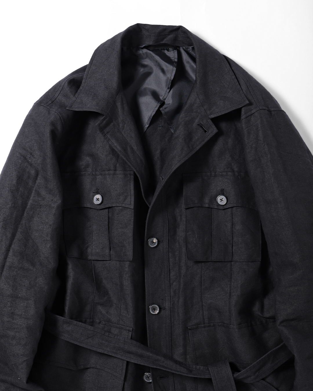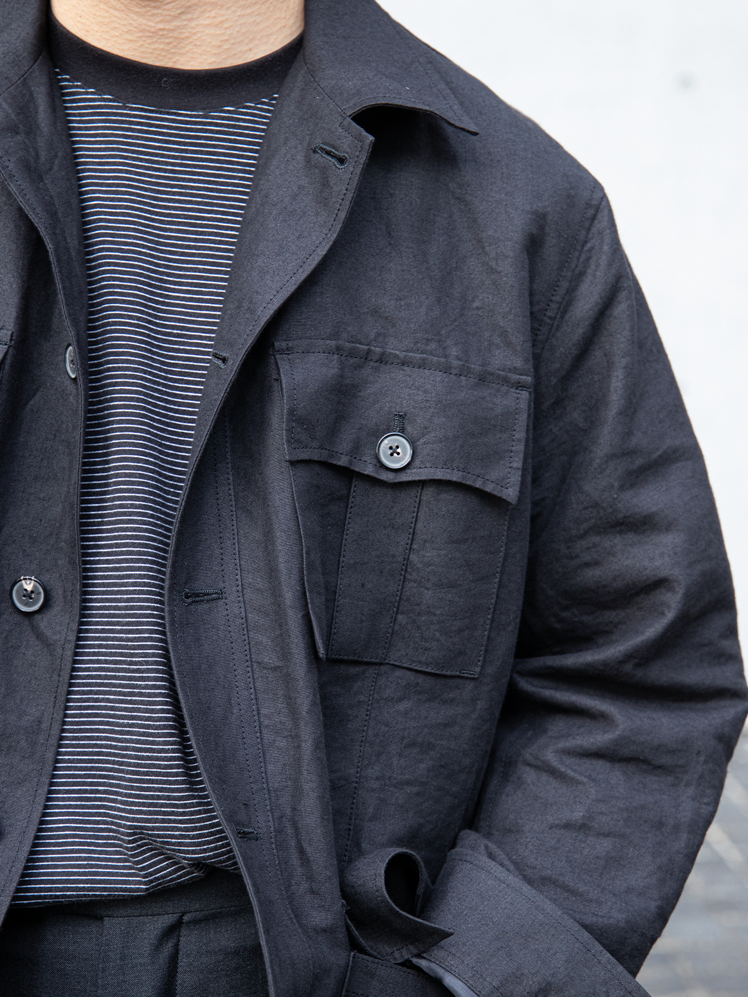 フィールドジャケットの実用性とクロージングメーカーならではのテーラリングの視点を融合させたこのモデルを、和紙とリネンの混紡素材で再構築しました。