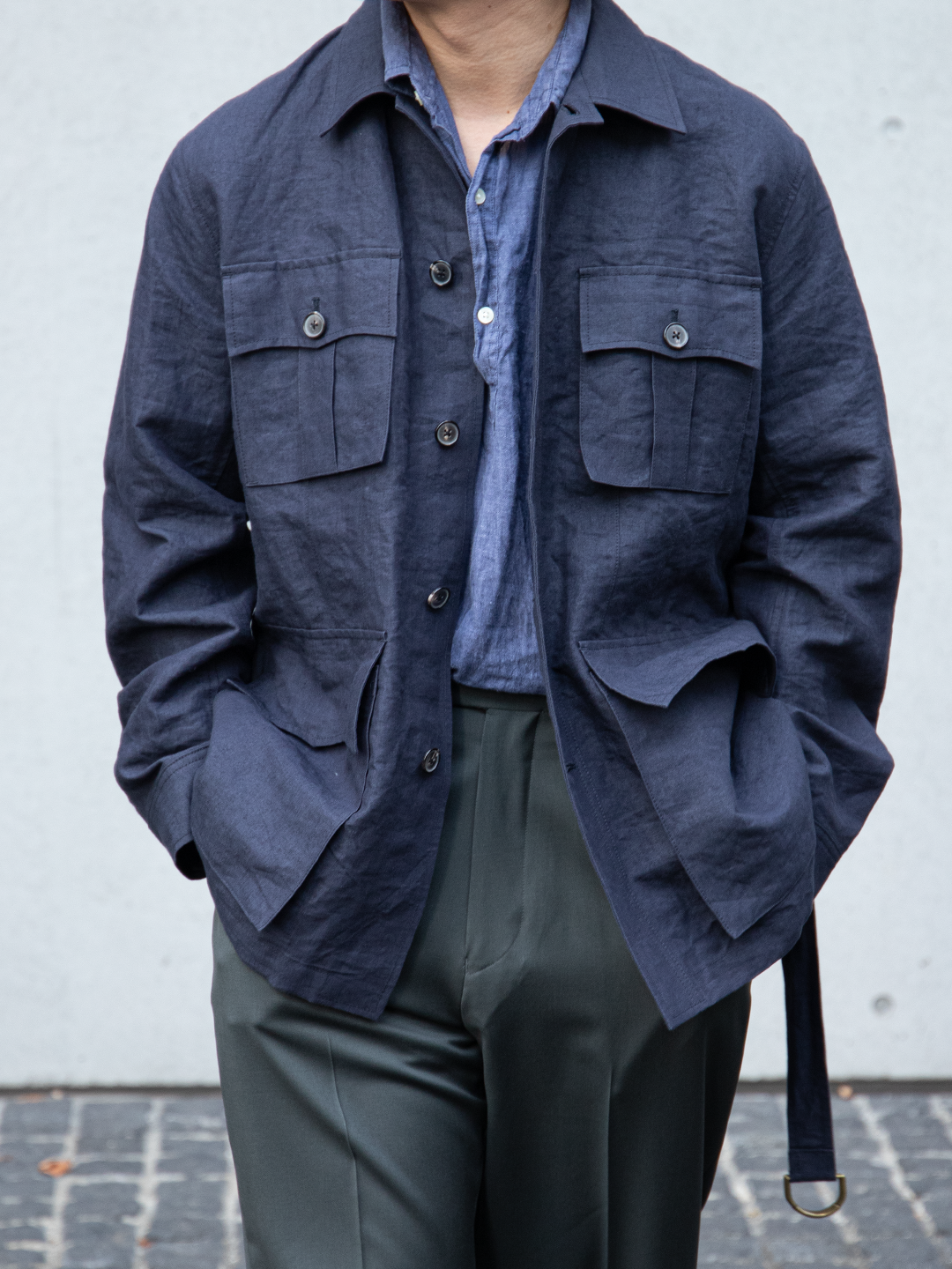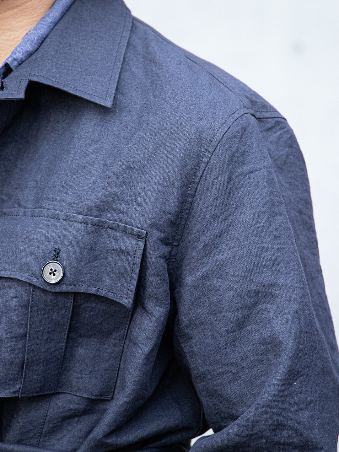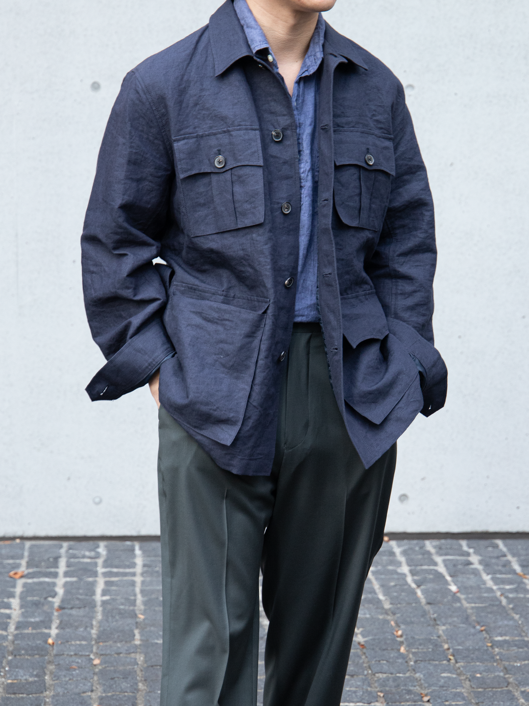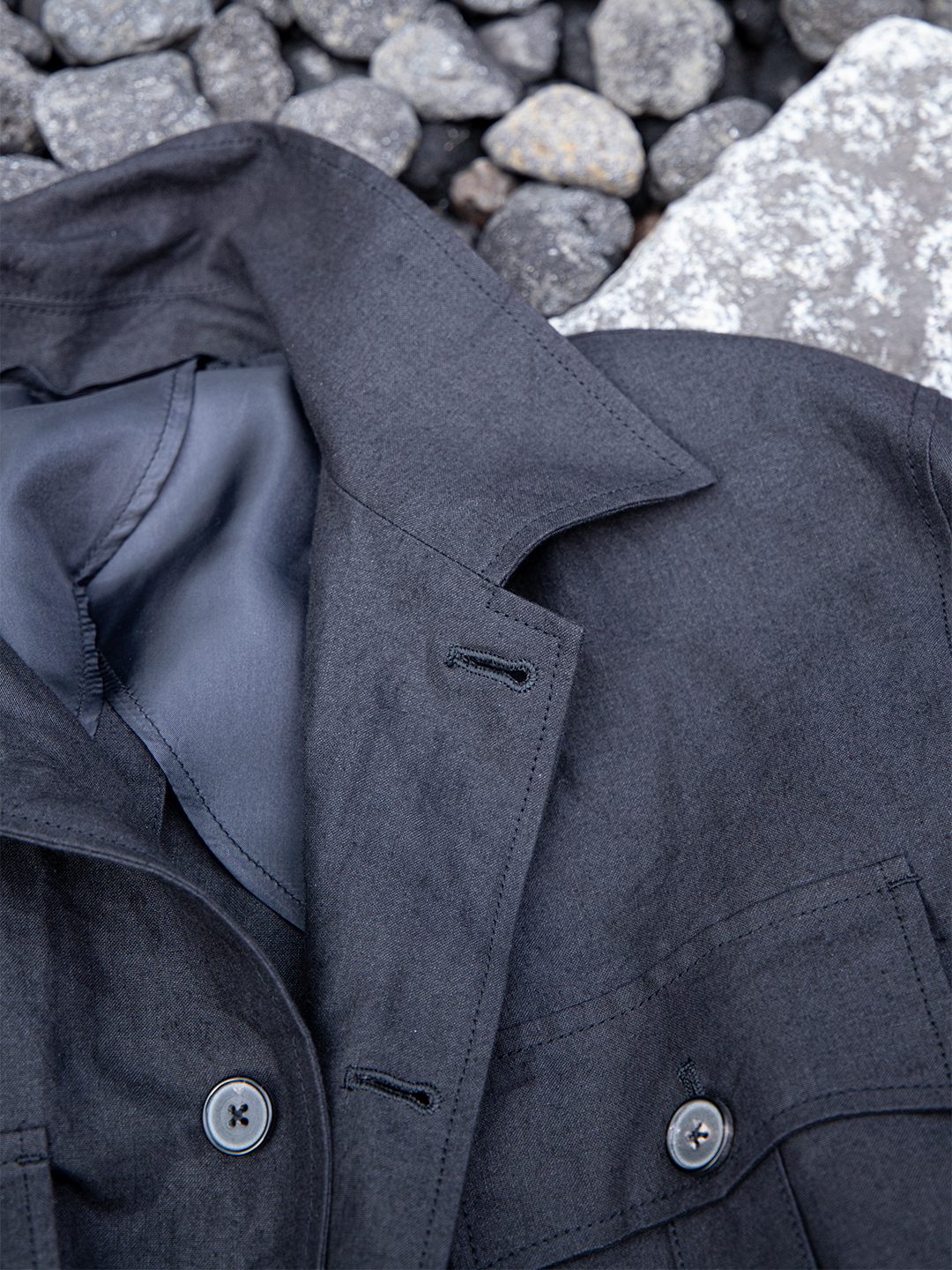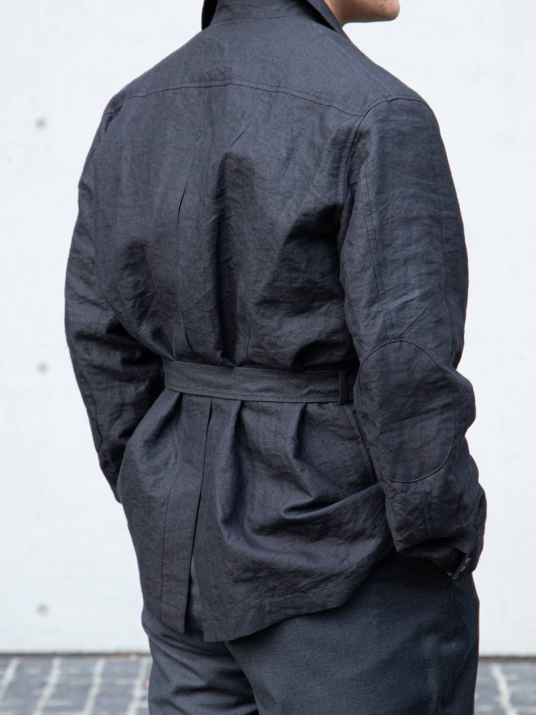 フィールドジャケットの実用性とクロージングメーカーならではのテーラリングの視点を融合させたこのモデルを、和紙とリネンの混紡素材で再構築しました。