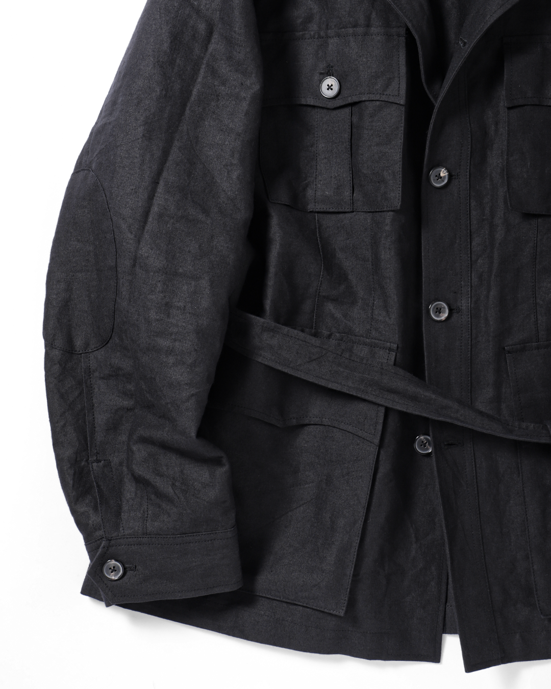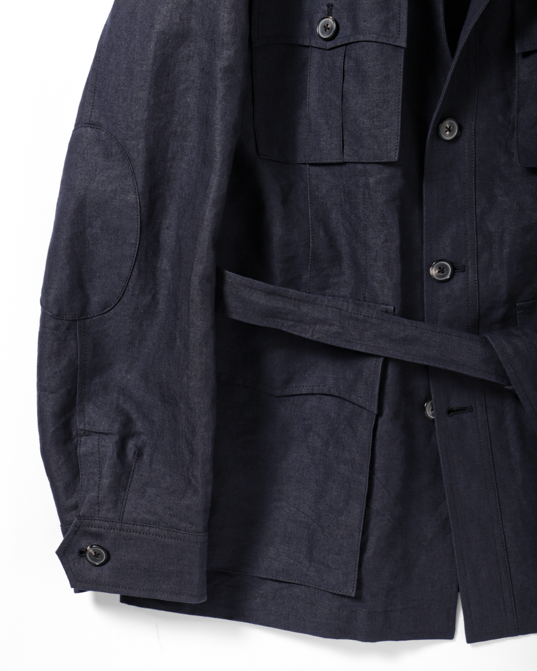 4つのフロントポケット、アクションプリーツ、エルボーパッチ、ウエストベルトといった、フィールドジャケットの基本的なディテールを踏襲。