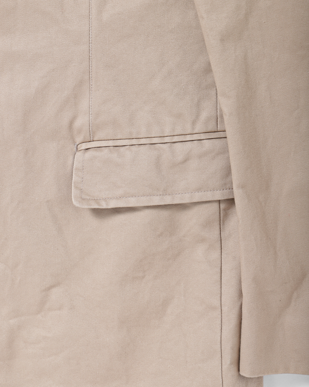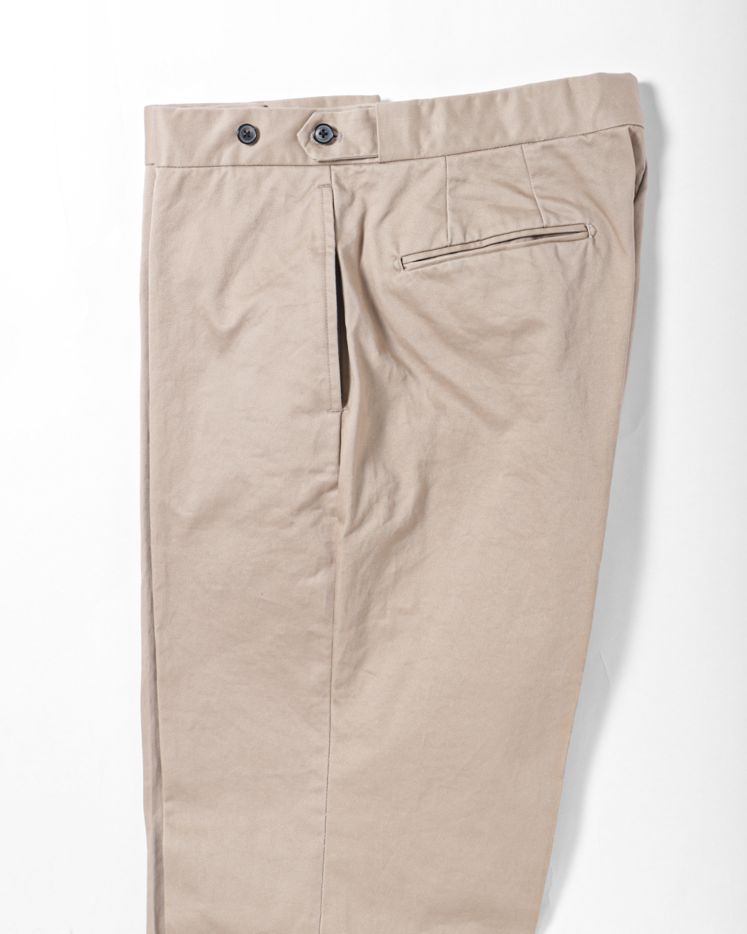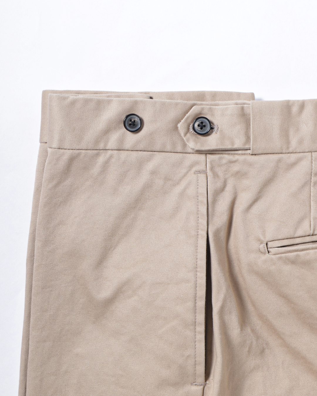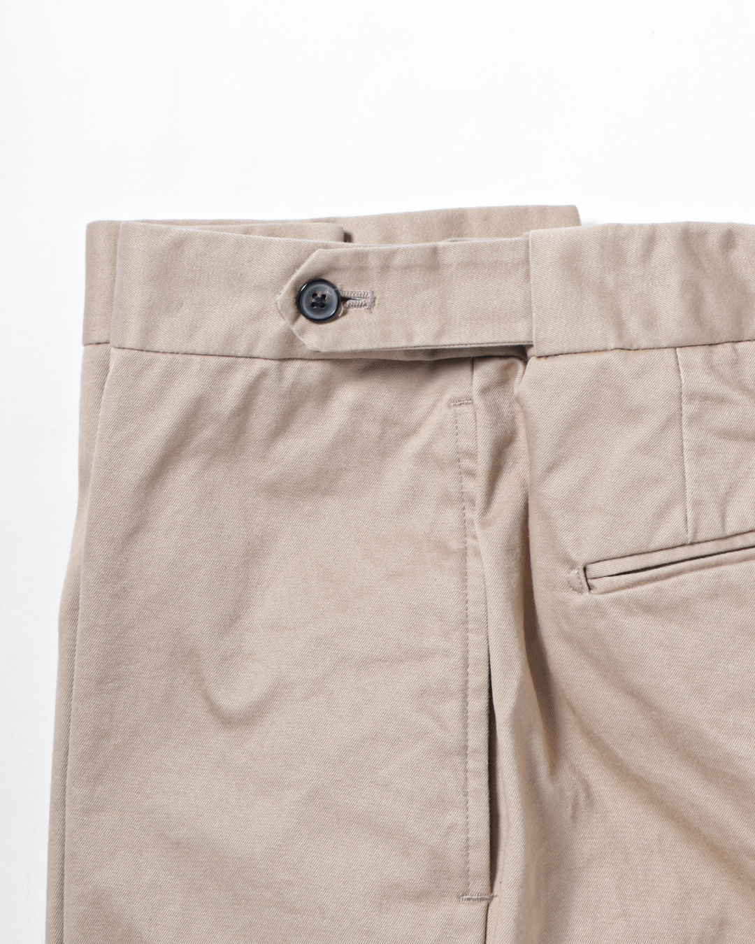 これは、チノ素材をワークウェアの延長線上に置くのではなくあくまでテーラードアイテムとして成立させるための選択です。