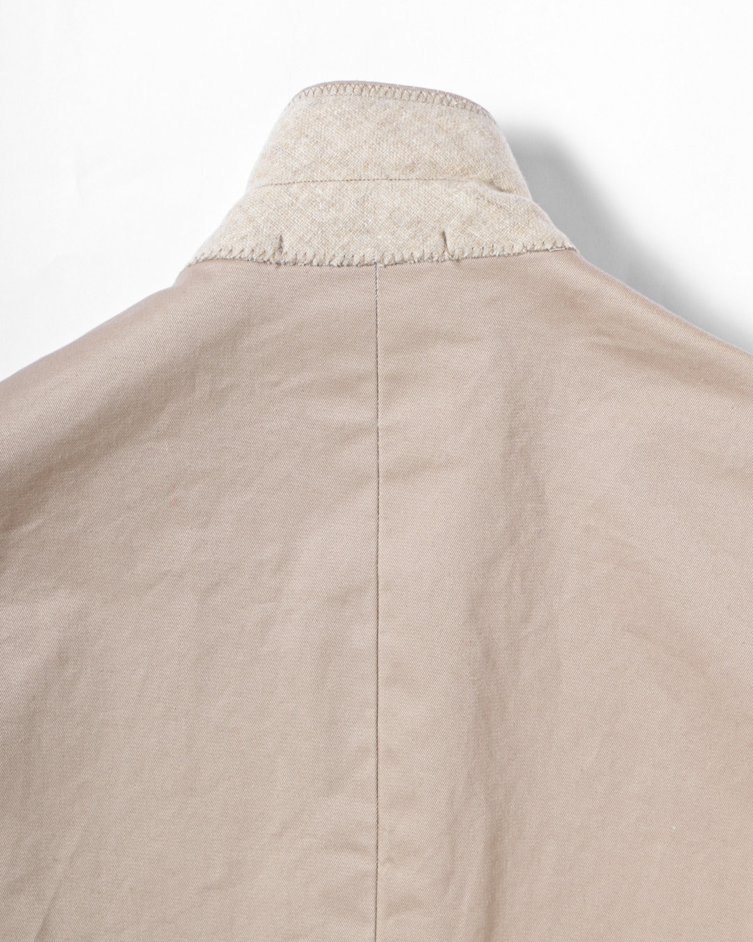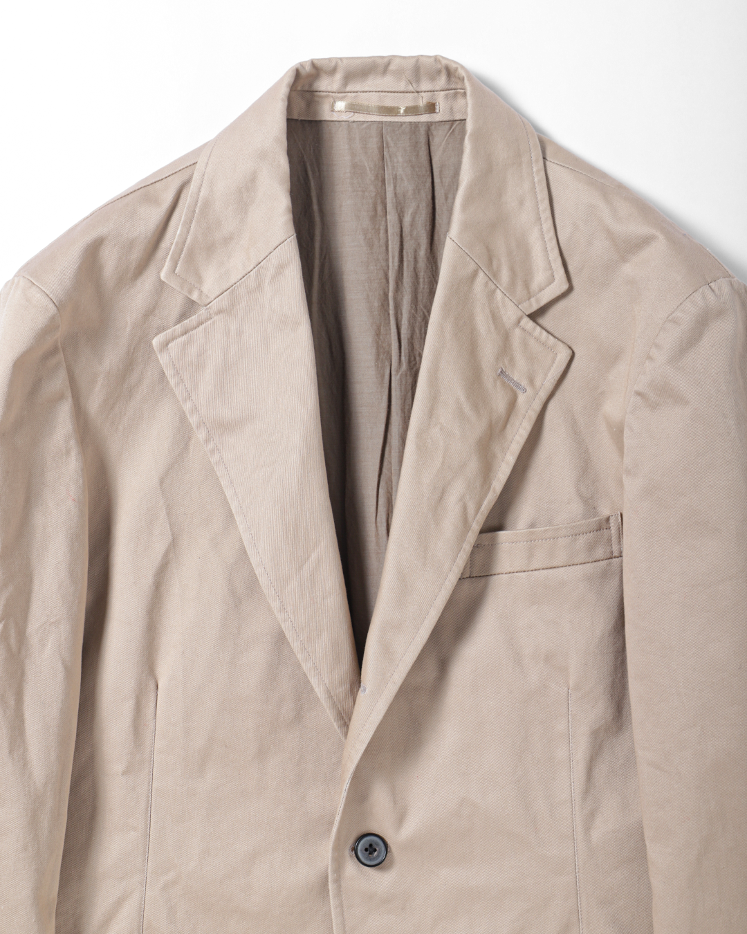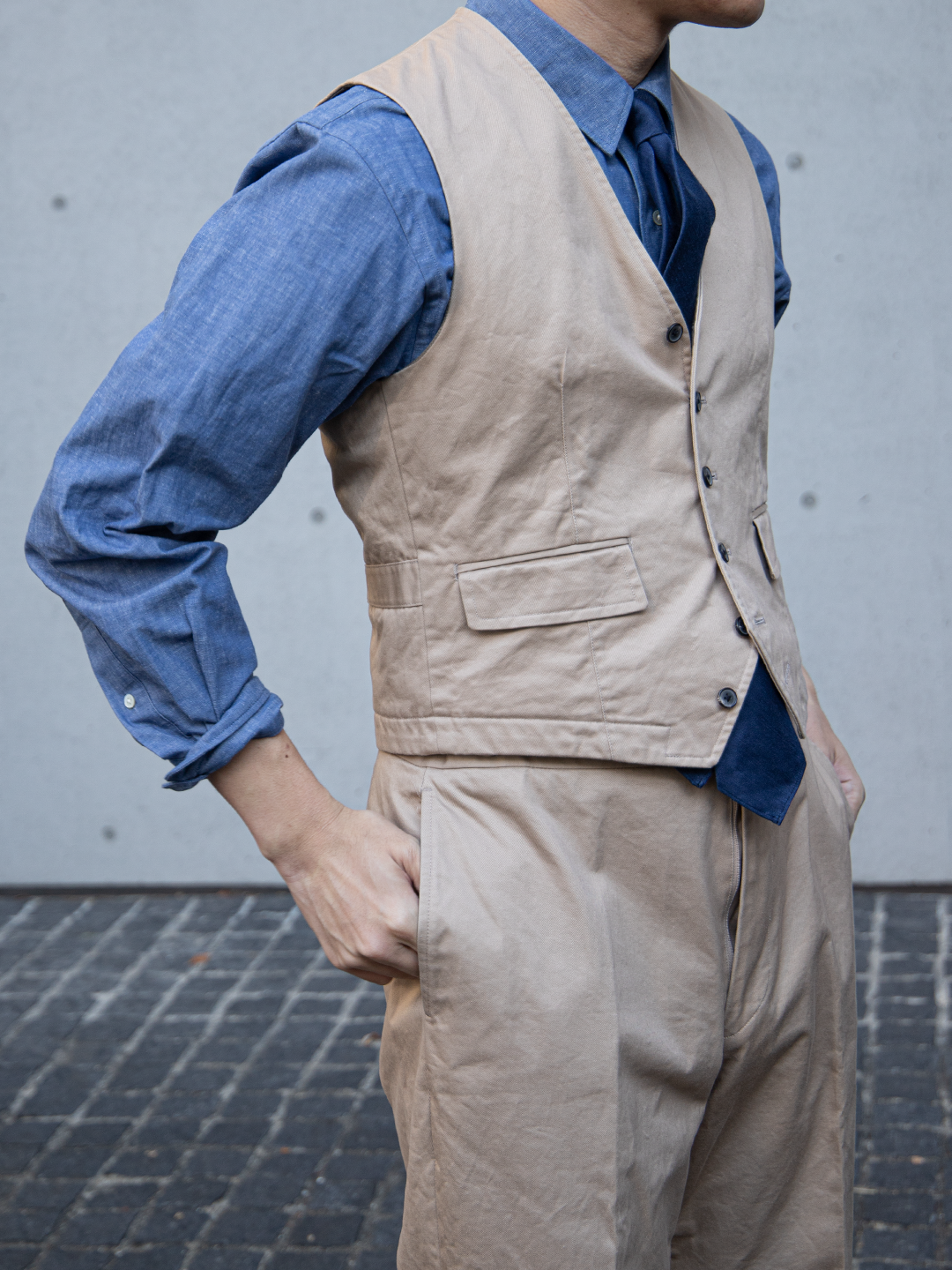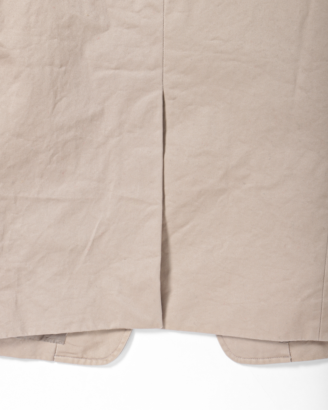 これは、チノ素材をワークウェアの延長線上に置くのではなくあくまでテーラードアイテムとして成立させるための選択です。