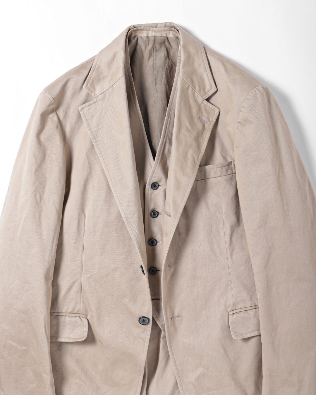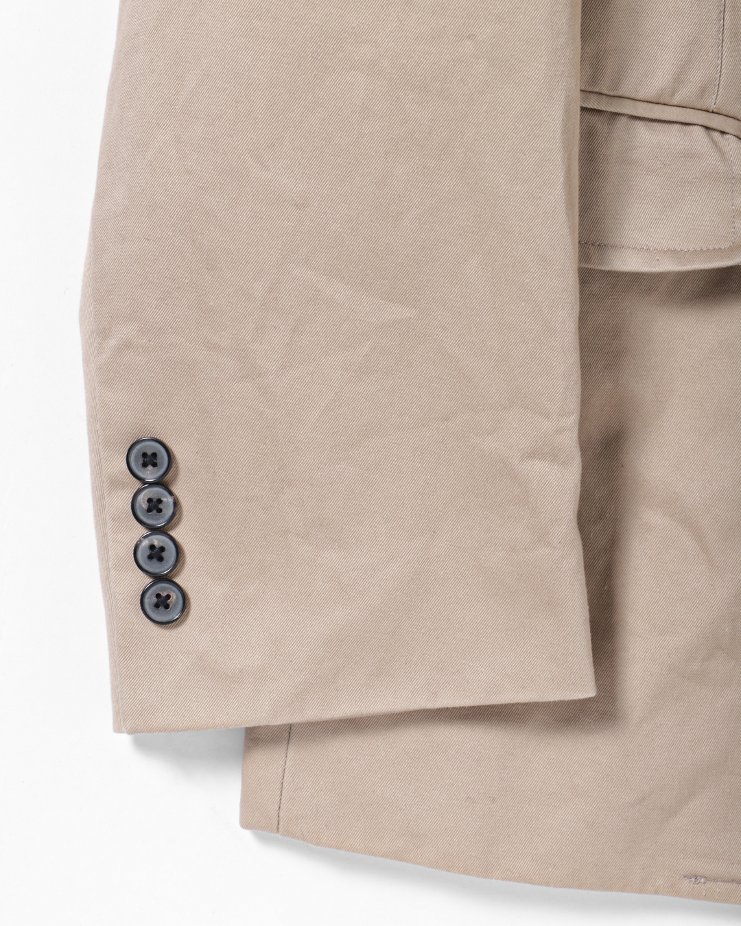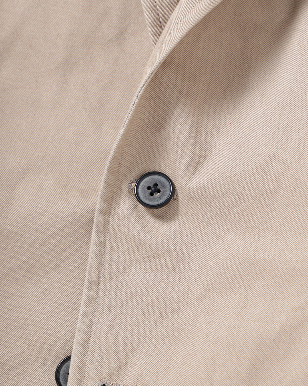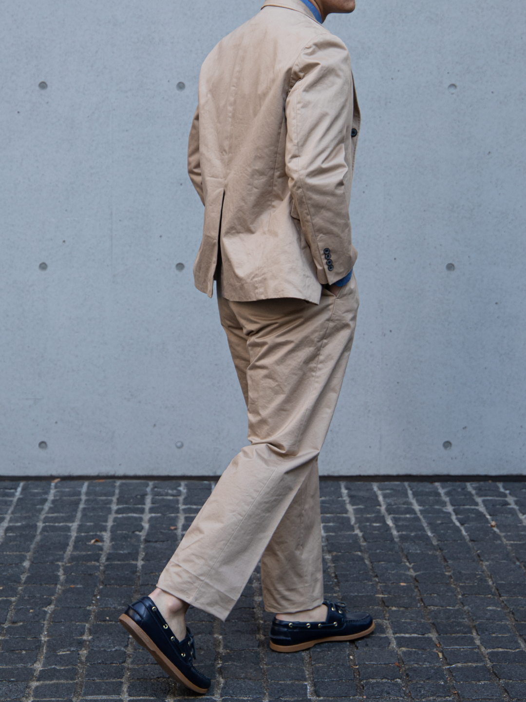 これは、チノ素材をワークウェアの延長線上に置くのではなくあくまでテーラードアイテムとして成立させるための選択です。