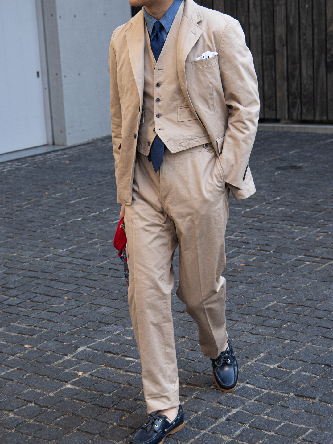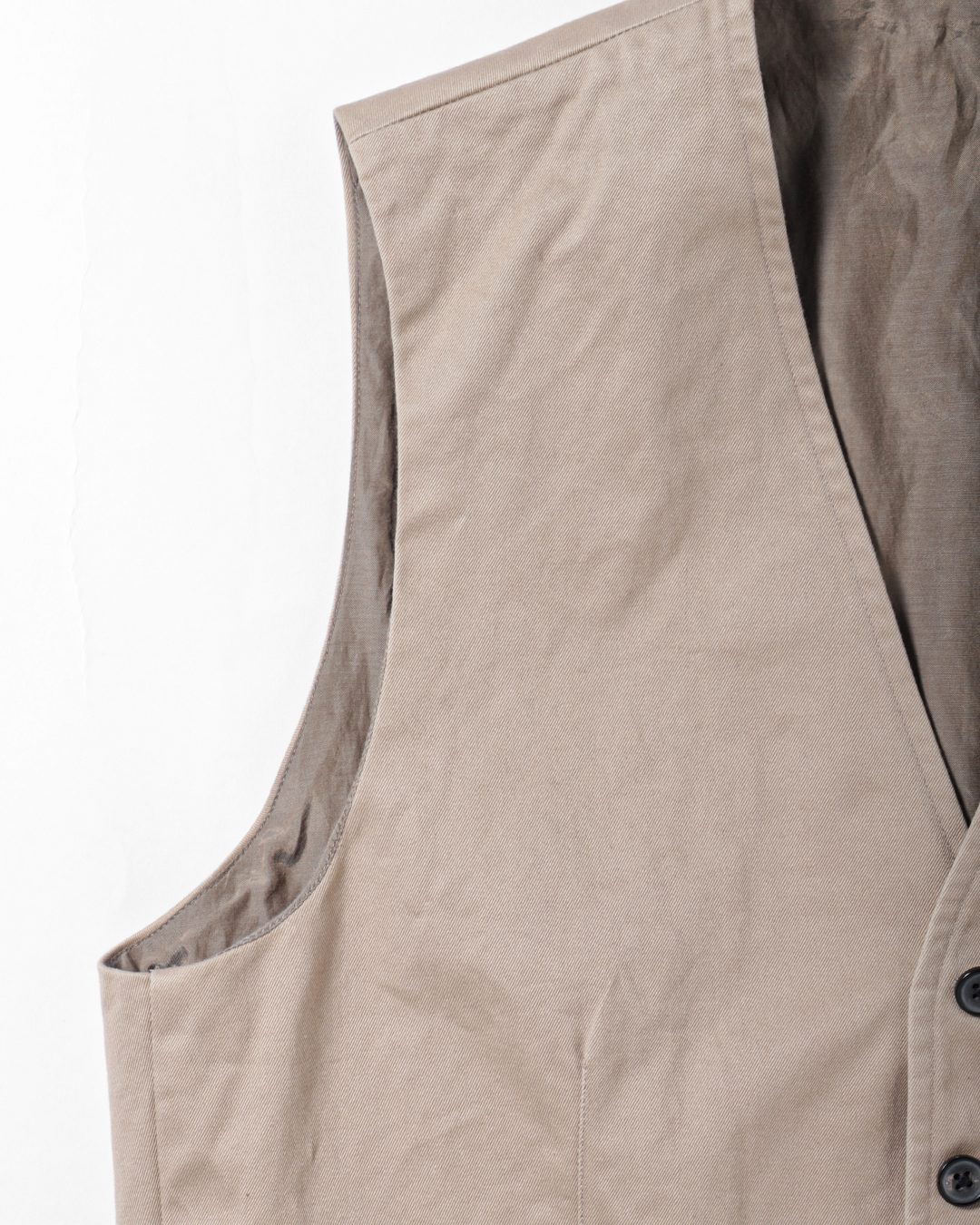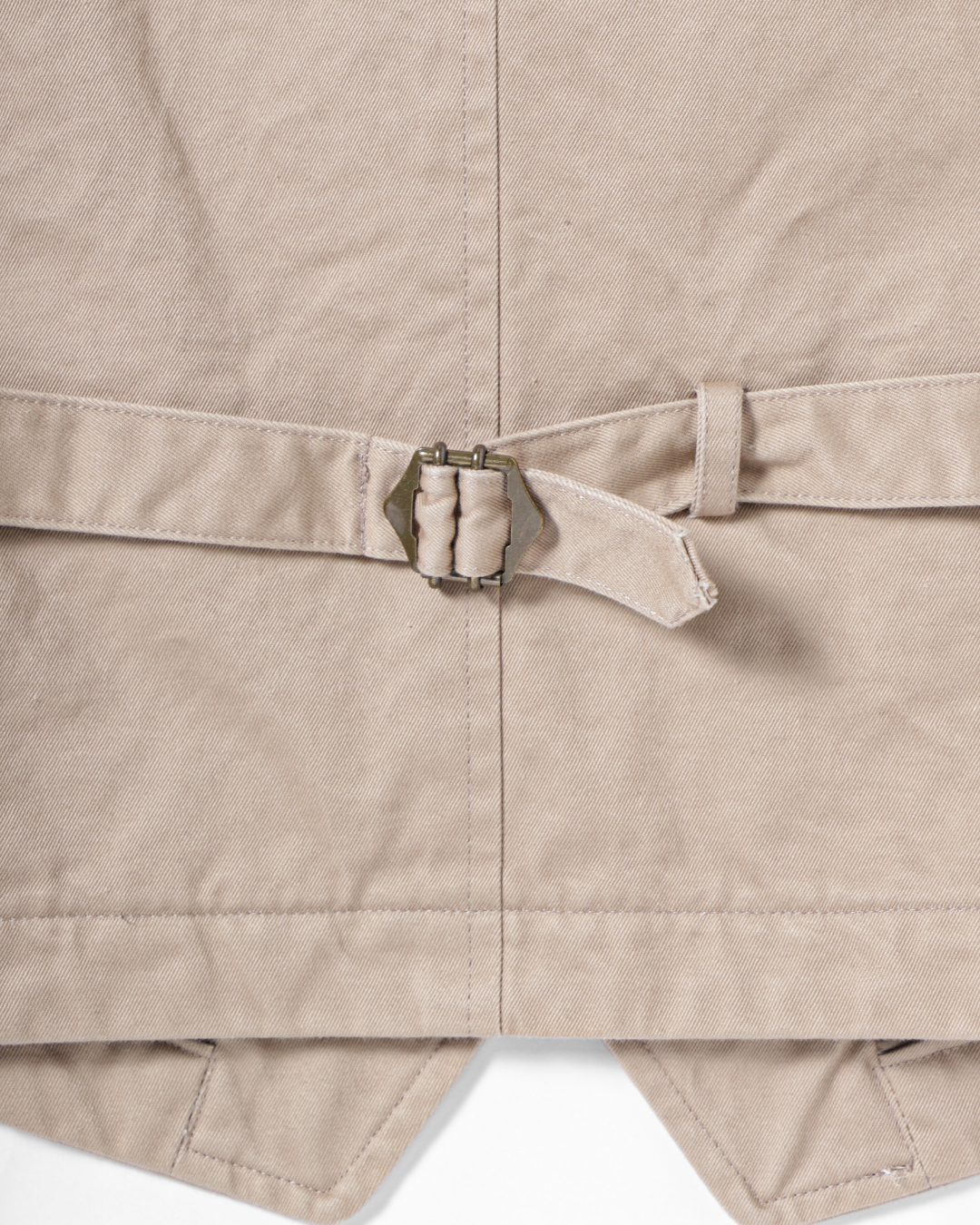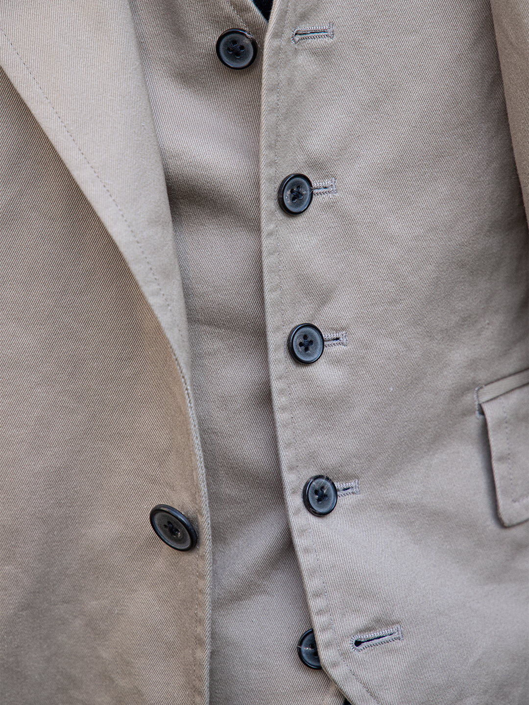 これは、チノ素材をワークウェアの延長線上に置くのではなくあくまでテーラードアイテムとして成立させるための選択です。