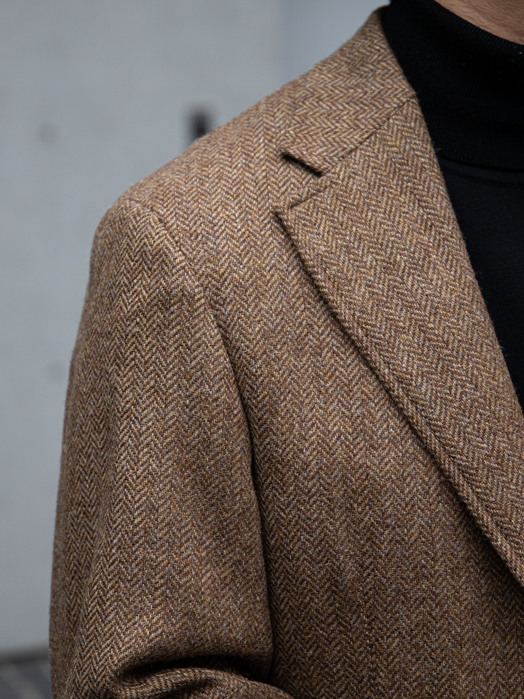 長時間の着用でも疲れさせない「軽量感」と、ジャケットの個性を決める「発色・柄」の2点を重視し、180年以上の歴史を持つ英国 アブラハム・ムーン社のツイードクロスを選びました。