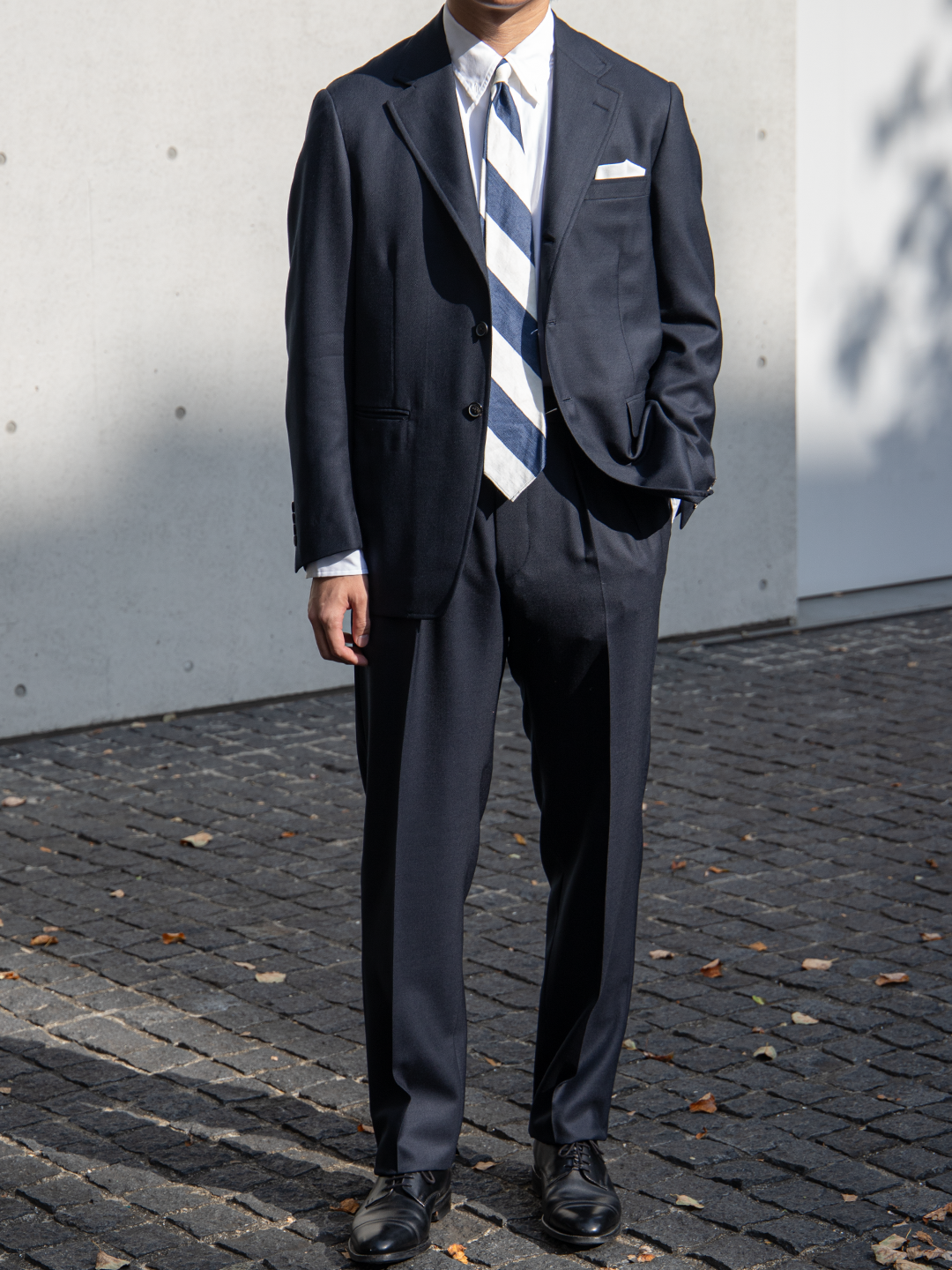 上質なウールサージを用いたこのスーツは英国にて1819年創業"John Foster"のファブリックを採用。