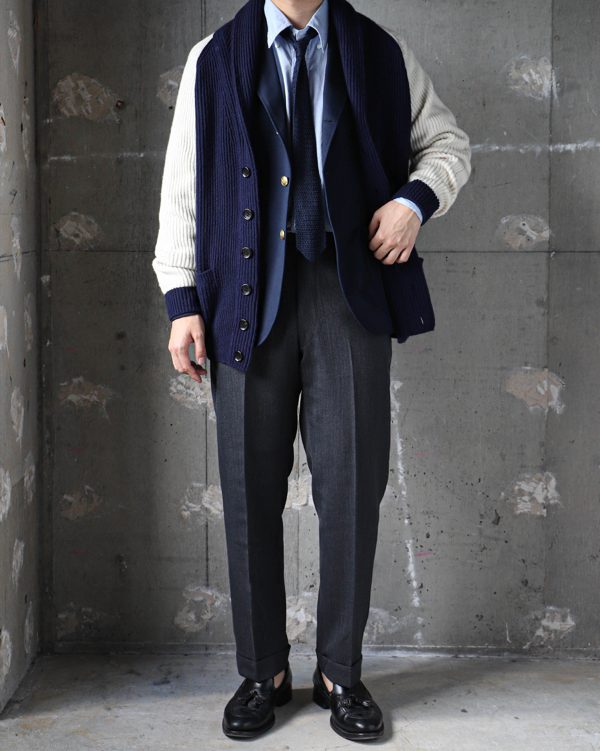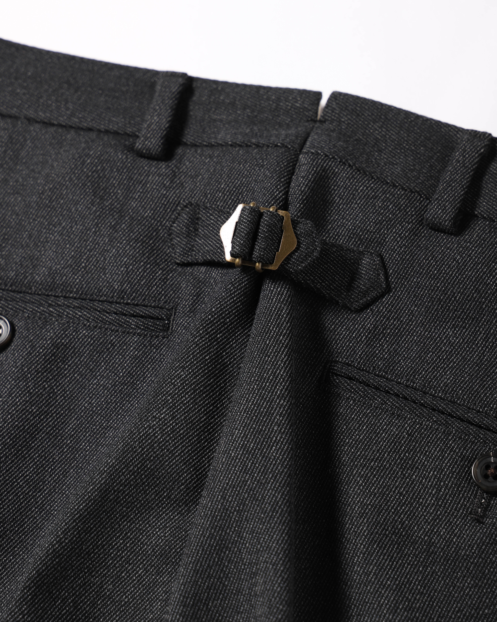 当モデルには、綾織65度のキャバルリーツイルを使用。ウールらしい艶やかでドレープのある素材感とツイルらしい生地立ちが良く存在感のある見え感を両立させることにより幅広いシーンに対応しています。