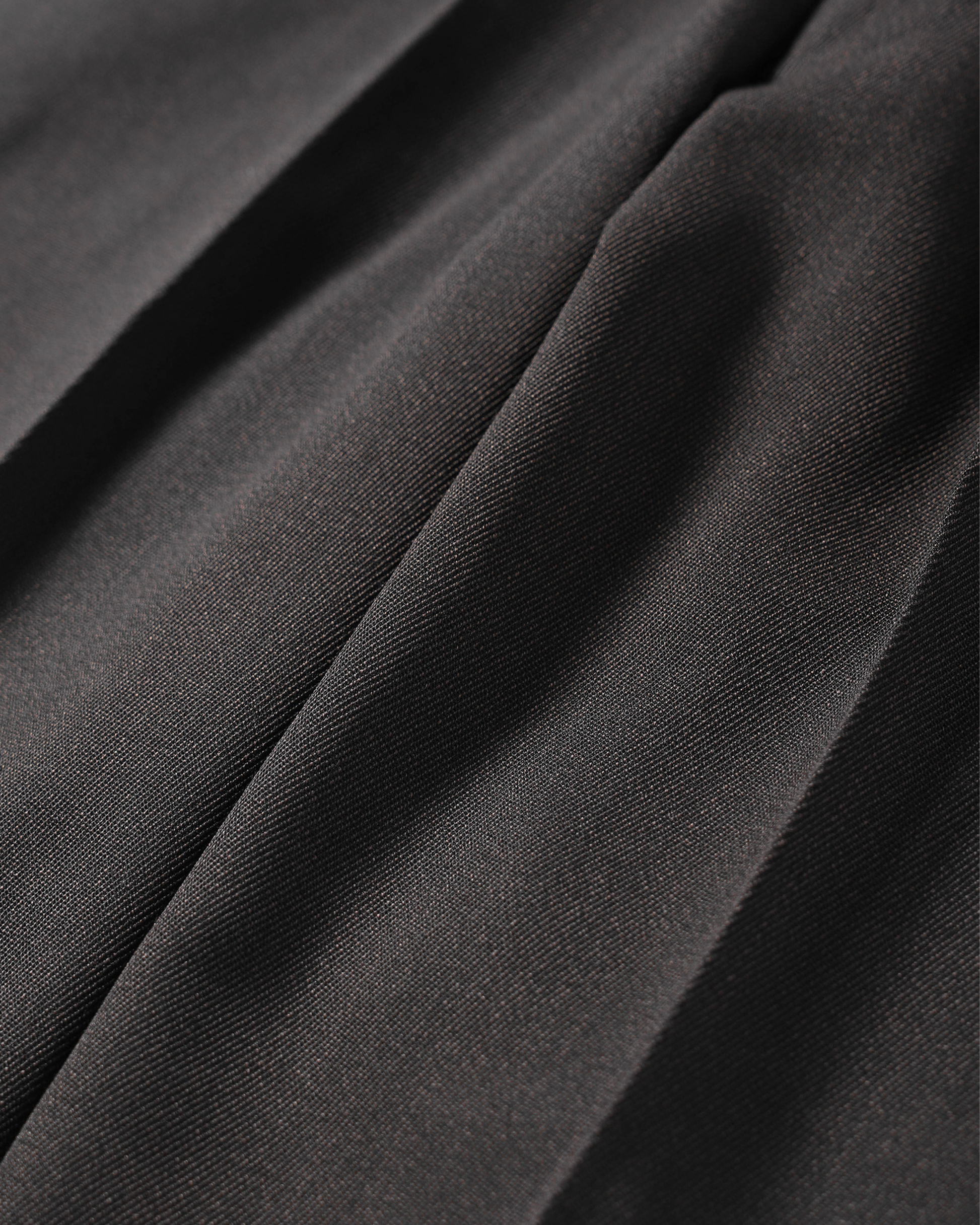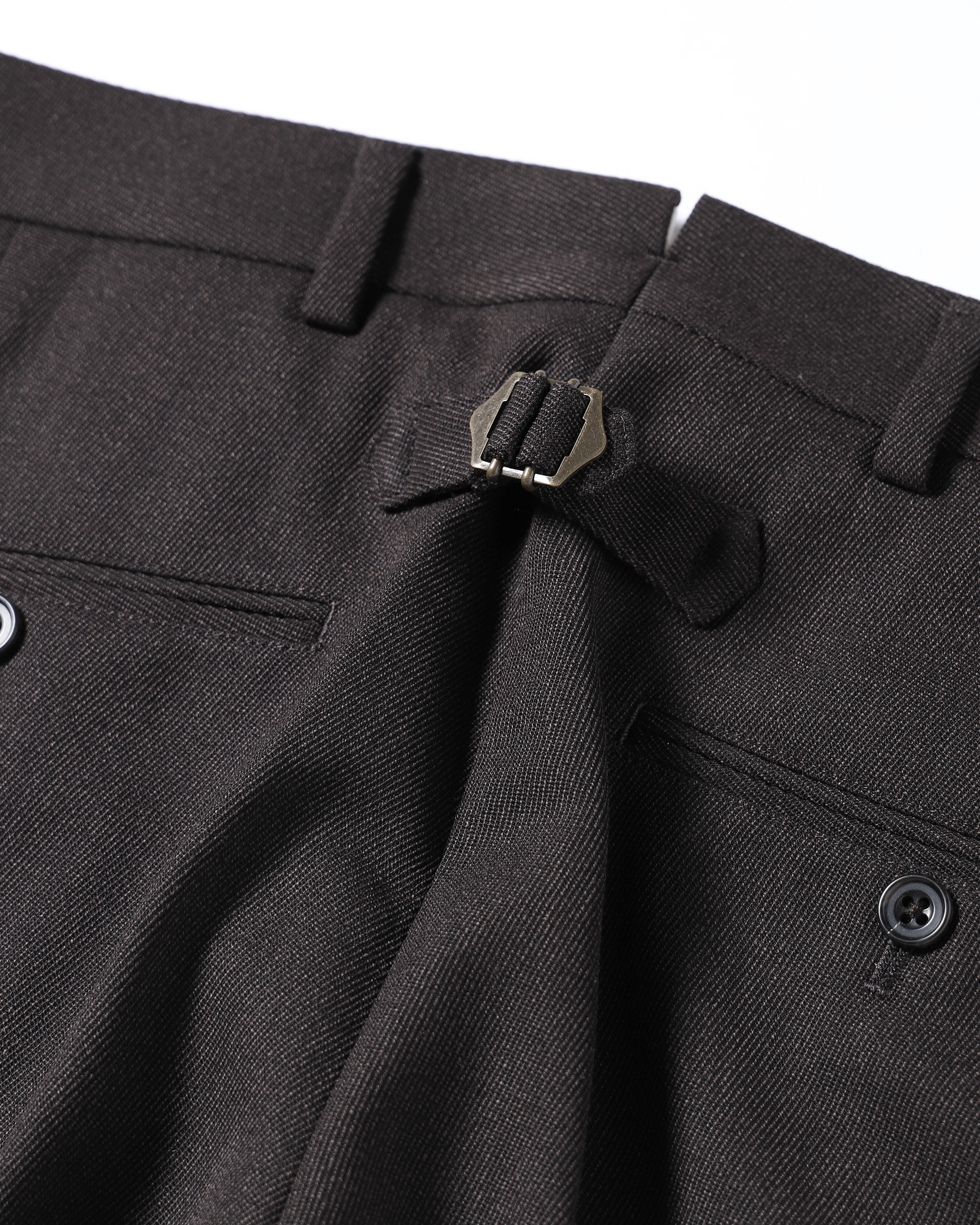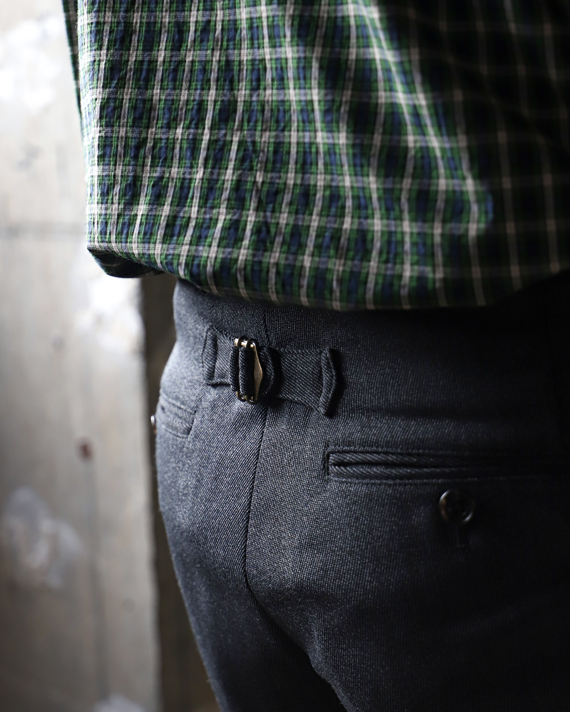 内股、外シーム、ヒップ部分には割縫いを採用しステッチワークが表面に出ず、トップスをタックインした際にはバック部分のアンティークゴールド尾錠がアクセントに。ドレッシーな仕様をカジュアルな見え感の素材で仕立てるアンバランス感を絶妙な塩梅で成立させました。