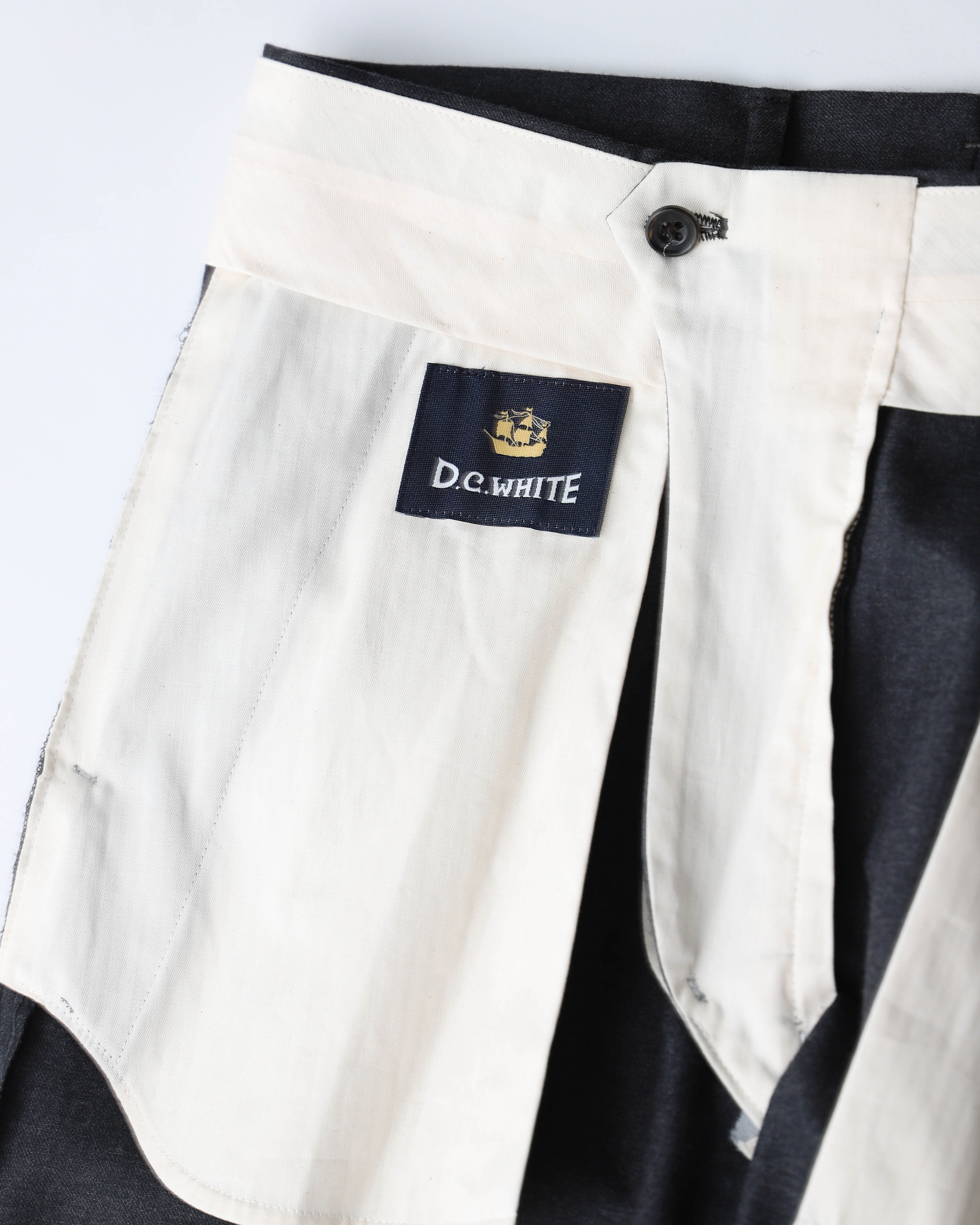 内股、外シーム、ヒップ部分には割縫いを採用しステッチワークが表面に出ず、トップスをタックインした際にはバック部分のアンティークゴールド尾錠がアクセントに。ドレッシーな仕様をカジュアルな見え感の素材で仕立てるアンバランス感を絶妙な塩梅で成立させました。