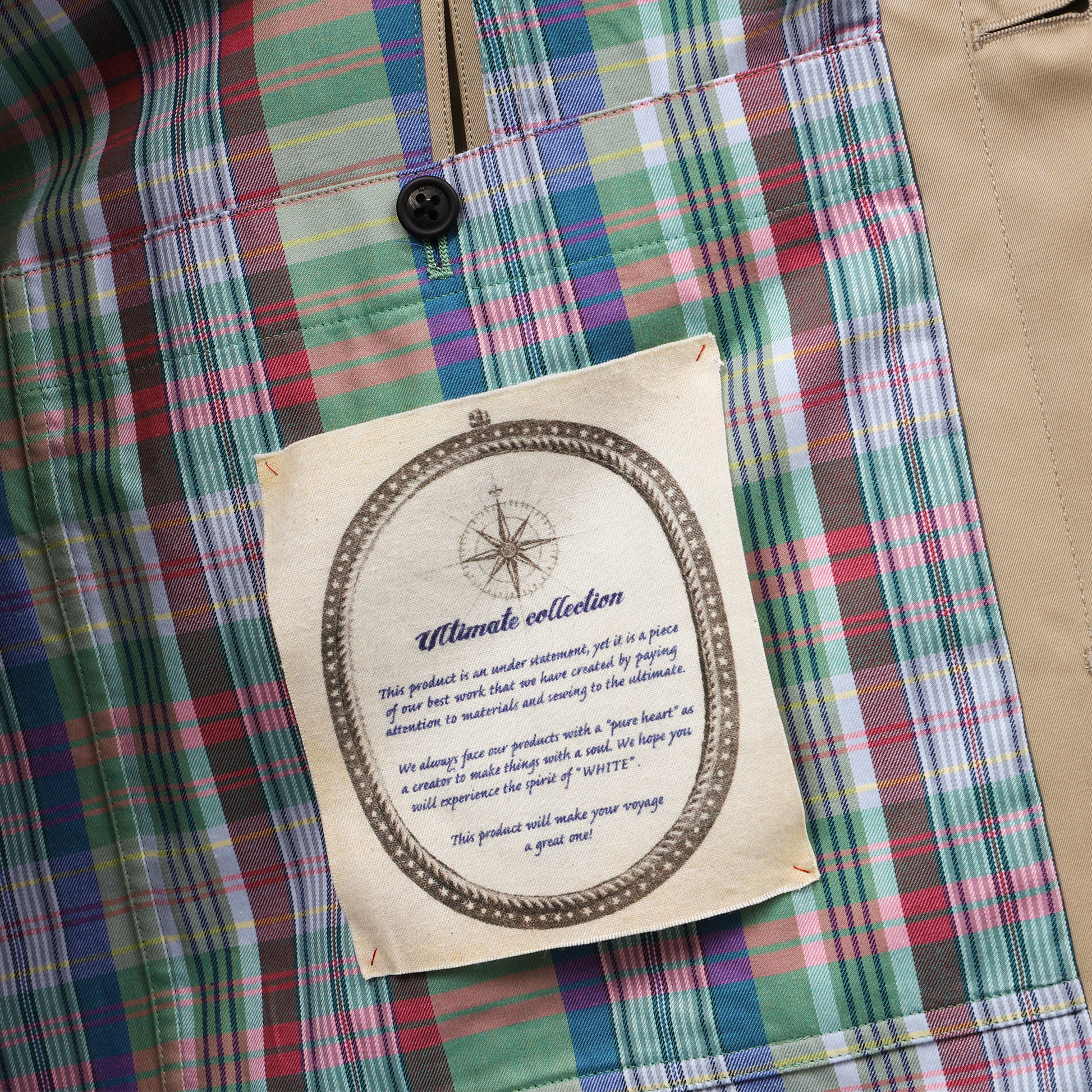 裏地に採用した発色の良いマドラスクロスライニング、ロゴ入りの水牛ボタンはどちらもD.C.WHITEが製作したオリジナルのものです。