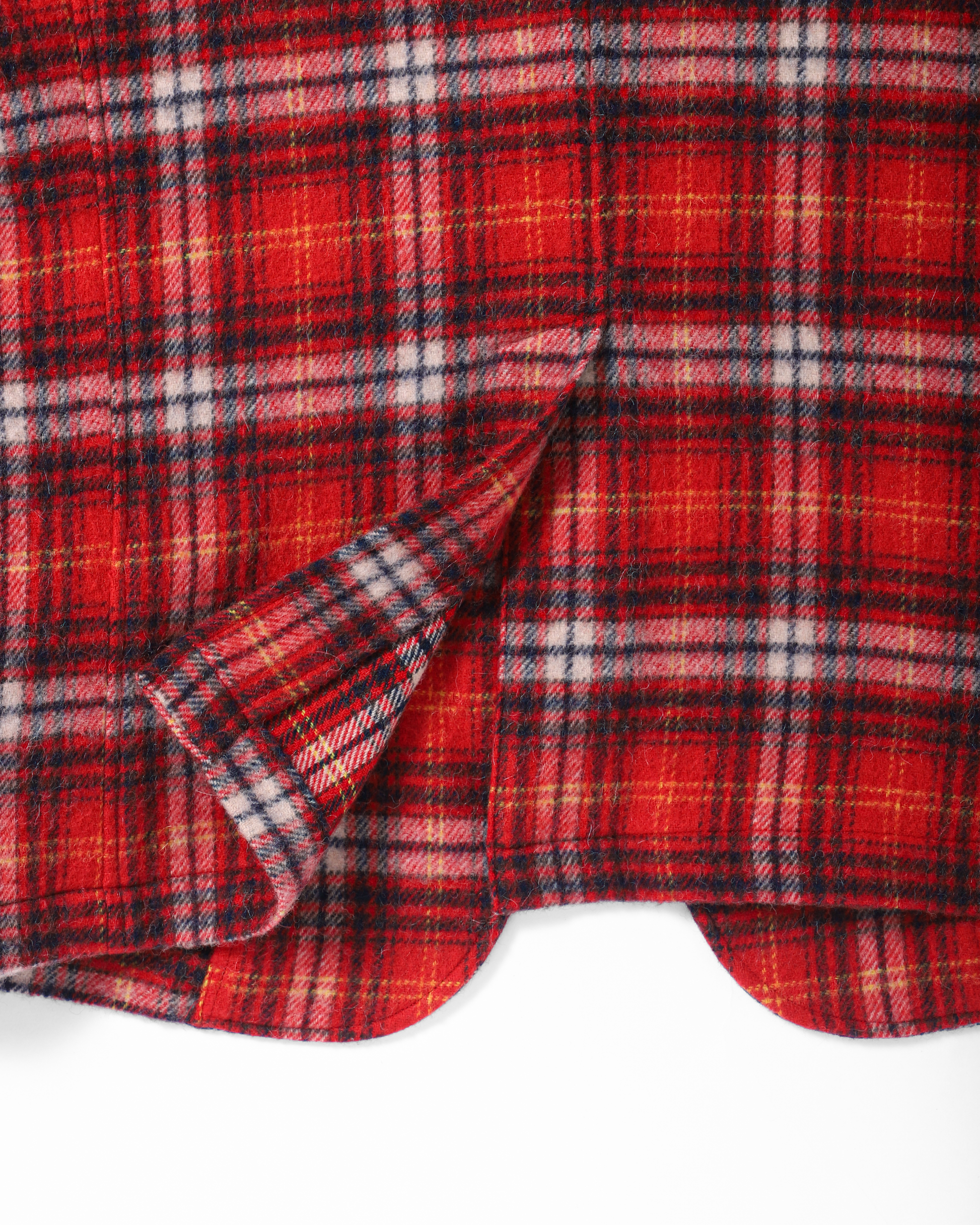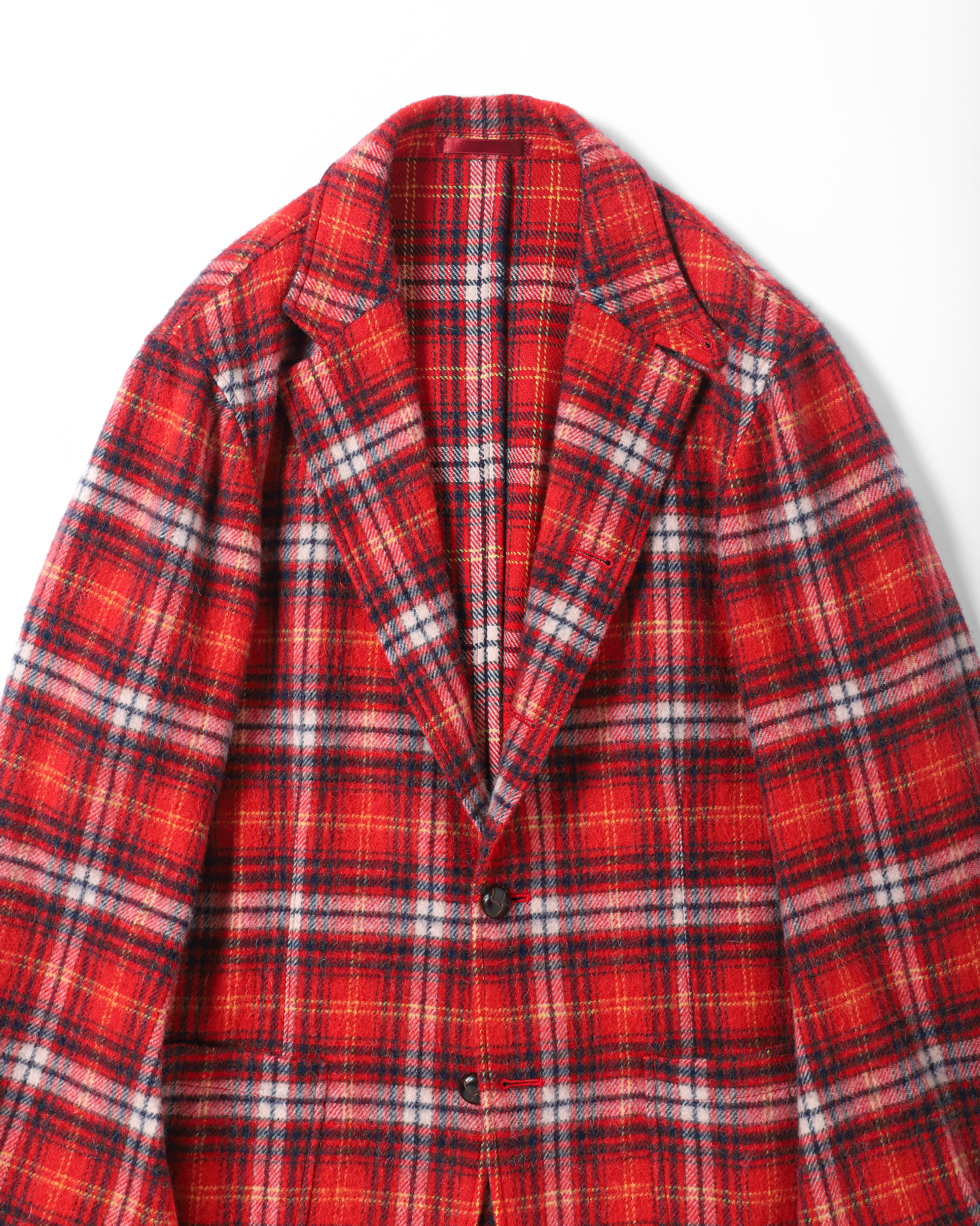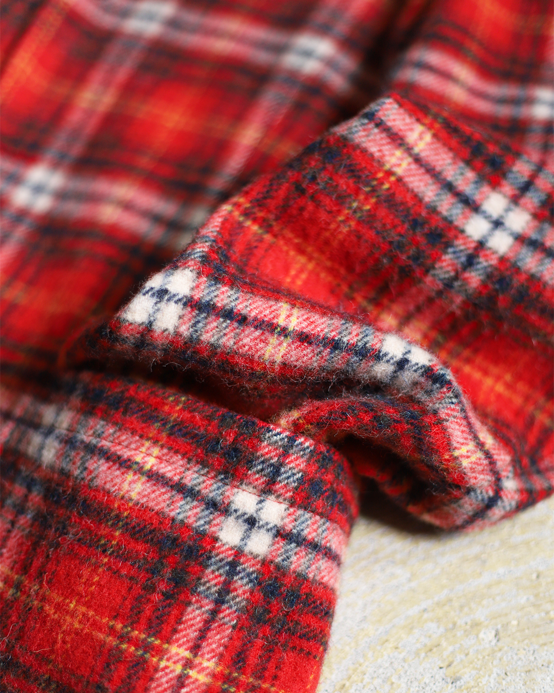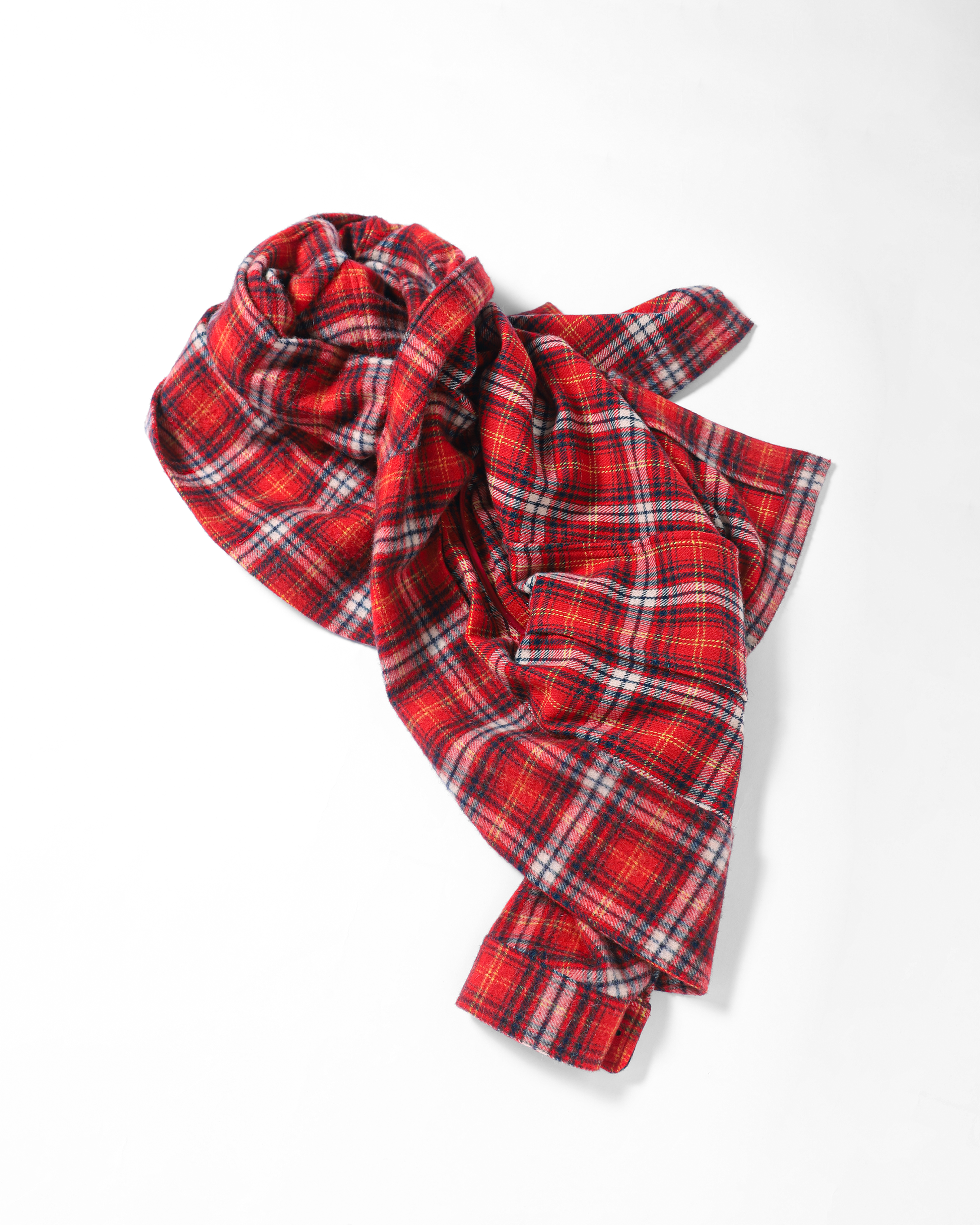 鮮やかな赤を基調としたチェックは冬の白銀の景色に映え、装いに鮮烈なアクセントを与えます。