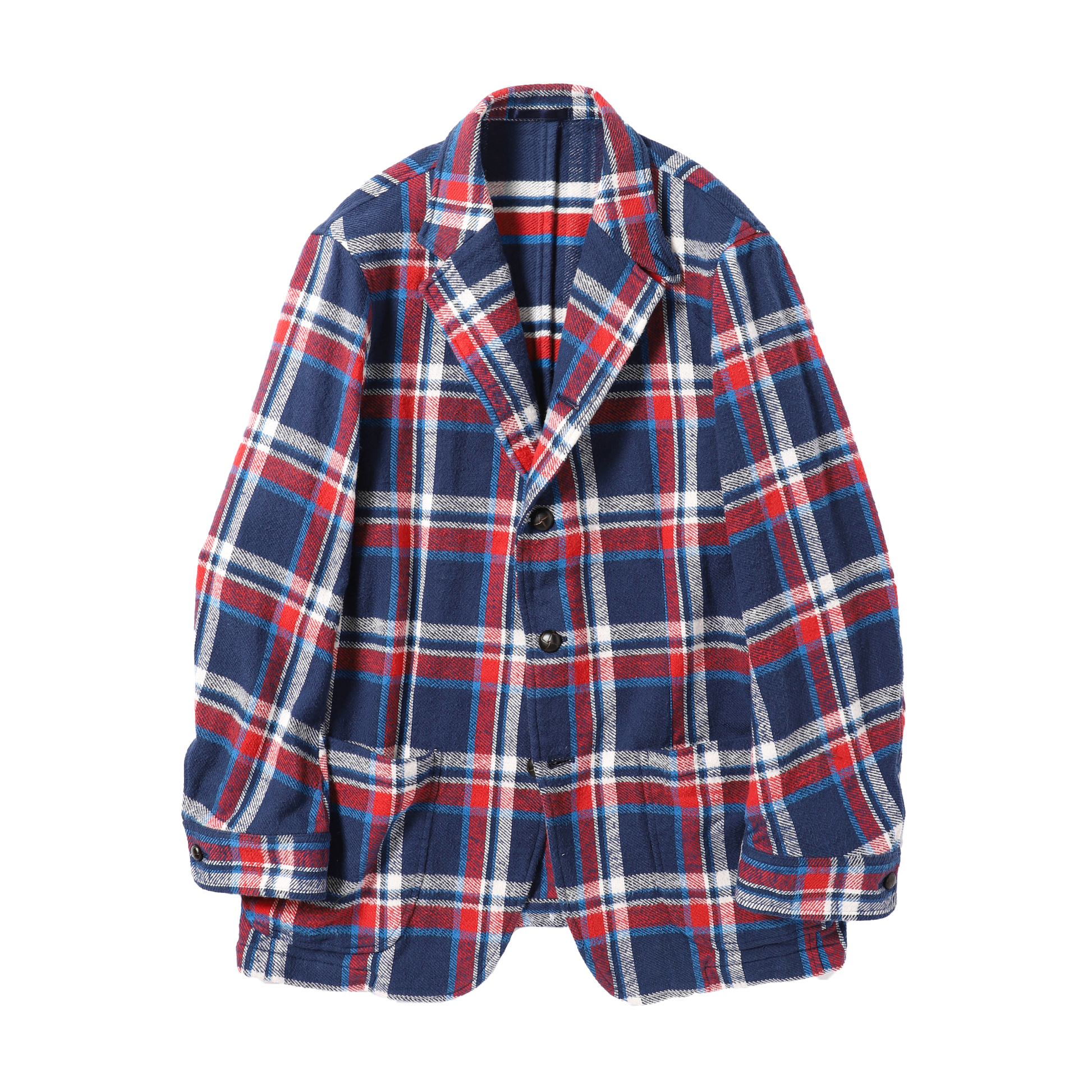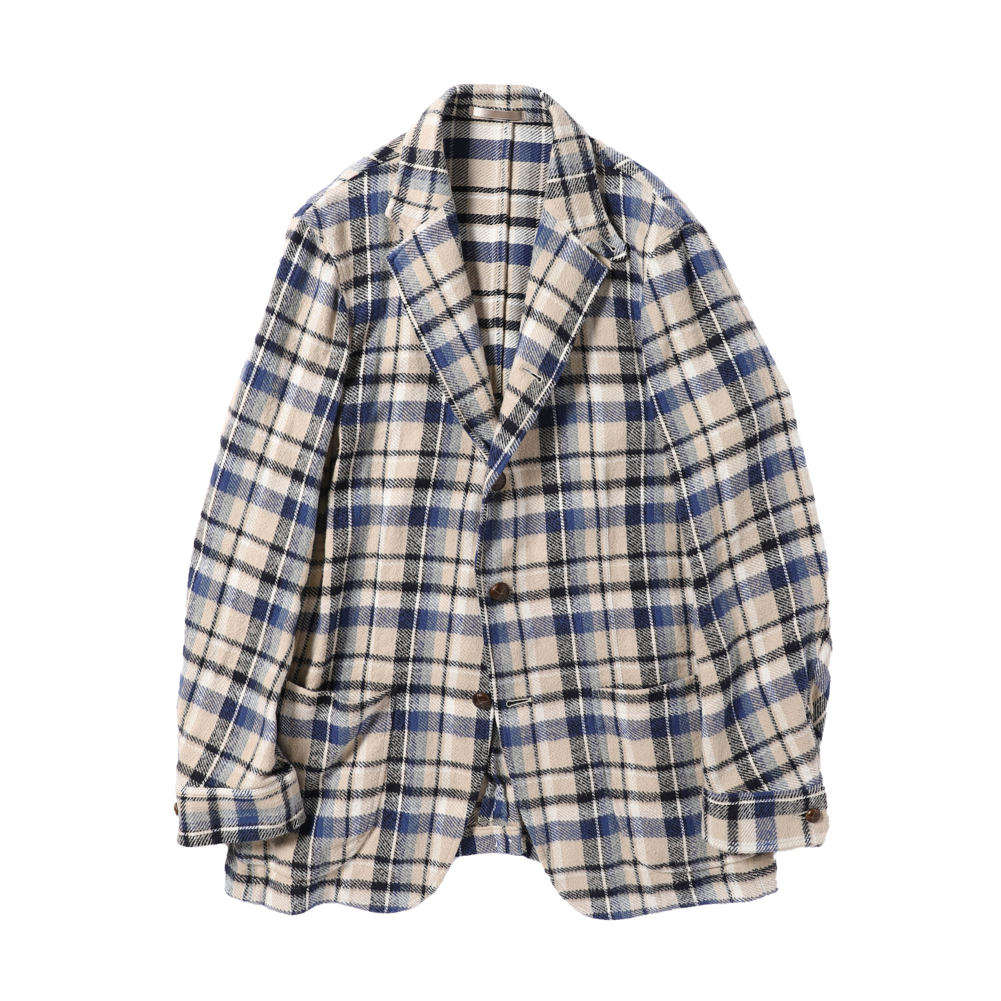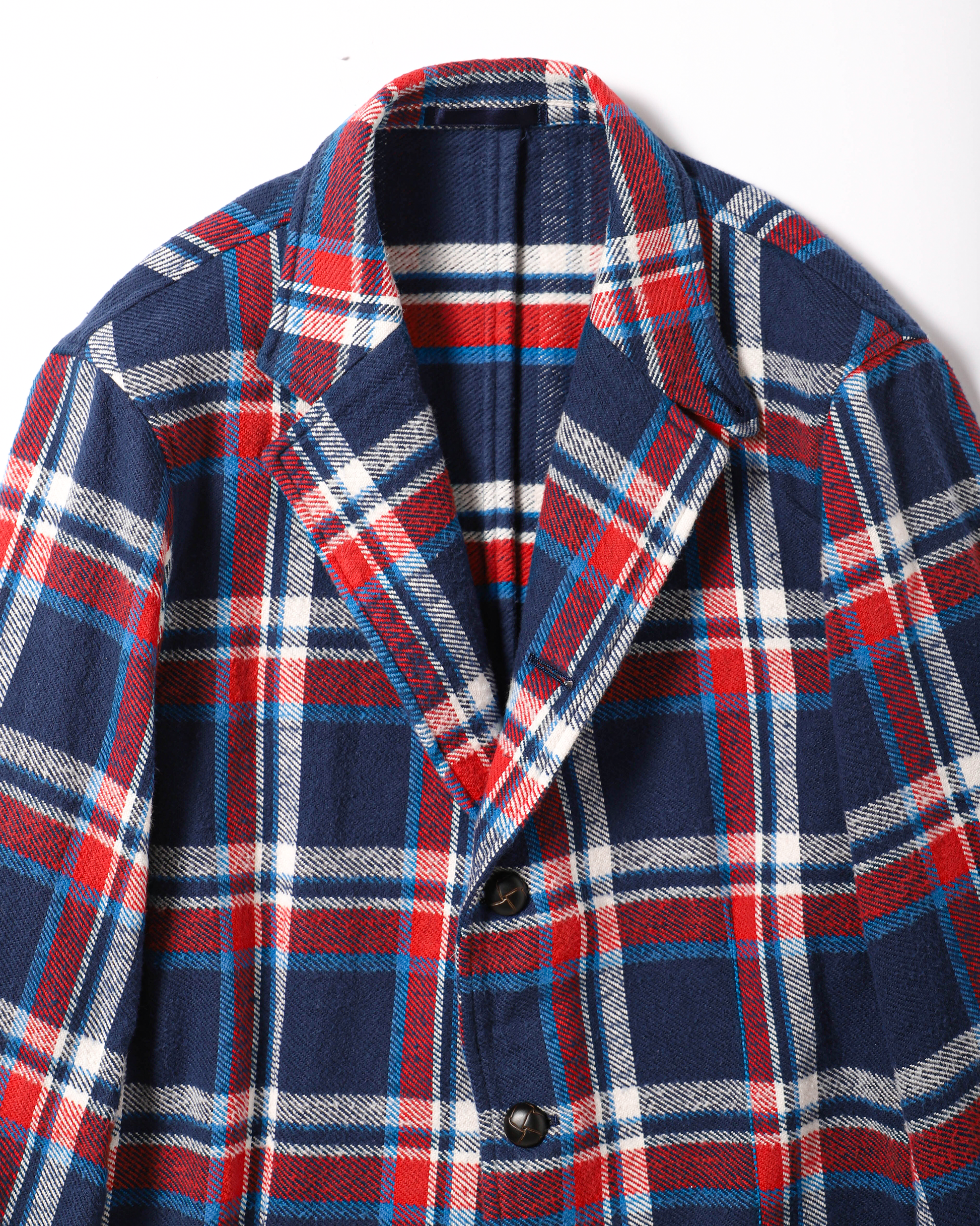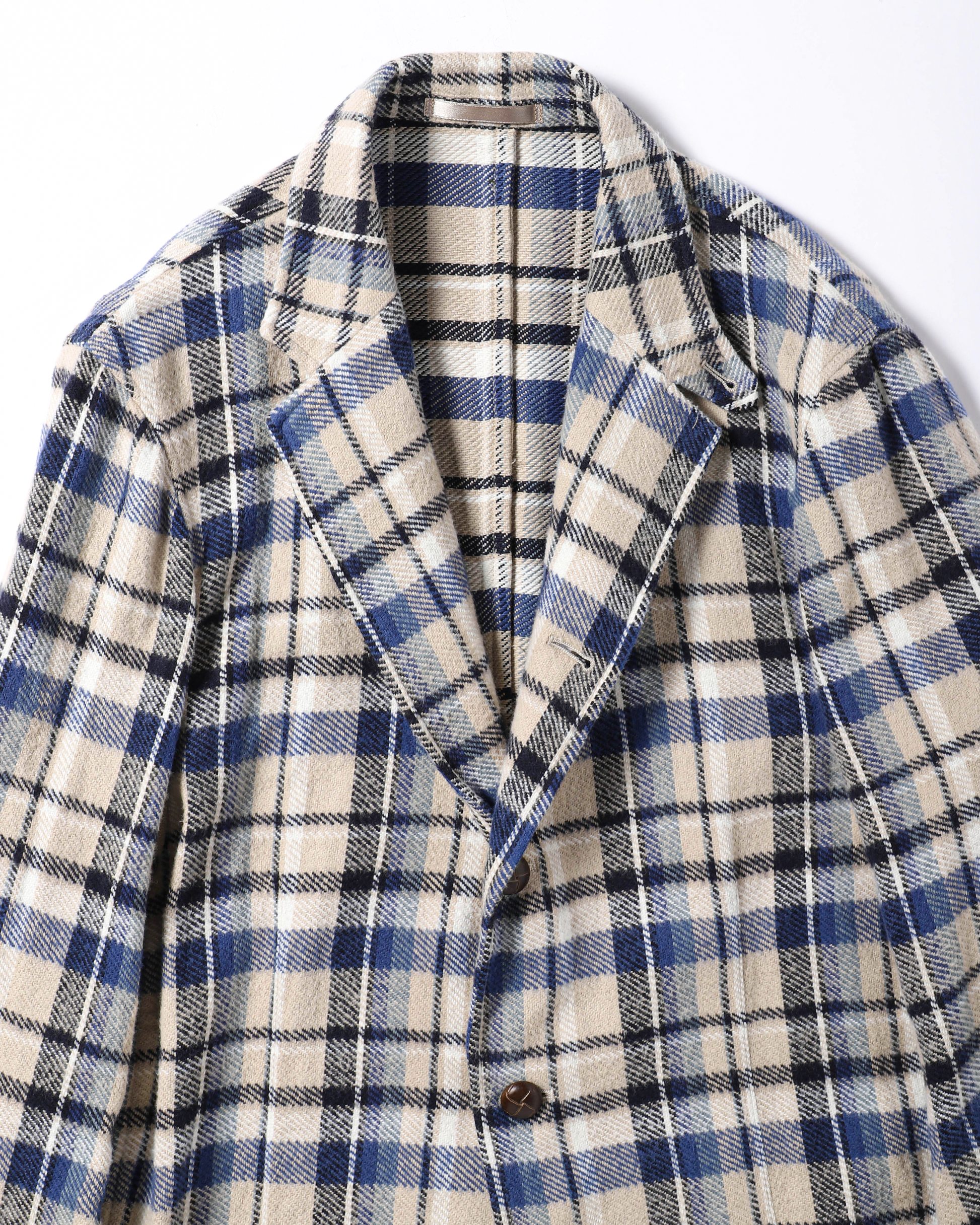 カントリーさを感じるいなたい印象のパターンで織られた、コットンフランネル素材を採用。古着のような色のくすみと起毛感を出すため製品時点でワンウォッシュをかけています。また、付属にはレザーのくるみボタンを使用しました。