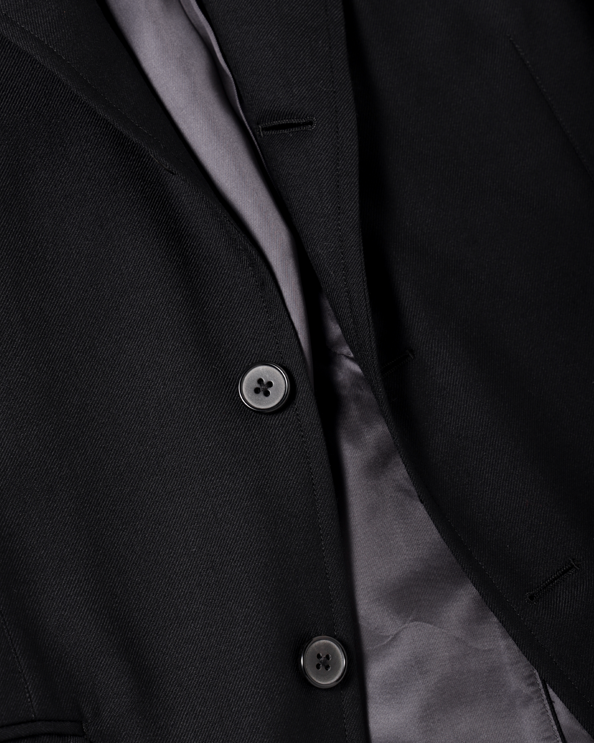 首に吸いつくような襟のラインややや広めに取られたラペル、やや低めに設定したゴージラインなどクラシックな要素を取り入れながらも、全体としてはコンパクトで都会的なシルエット。