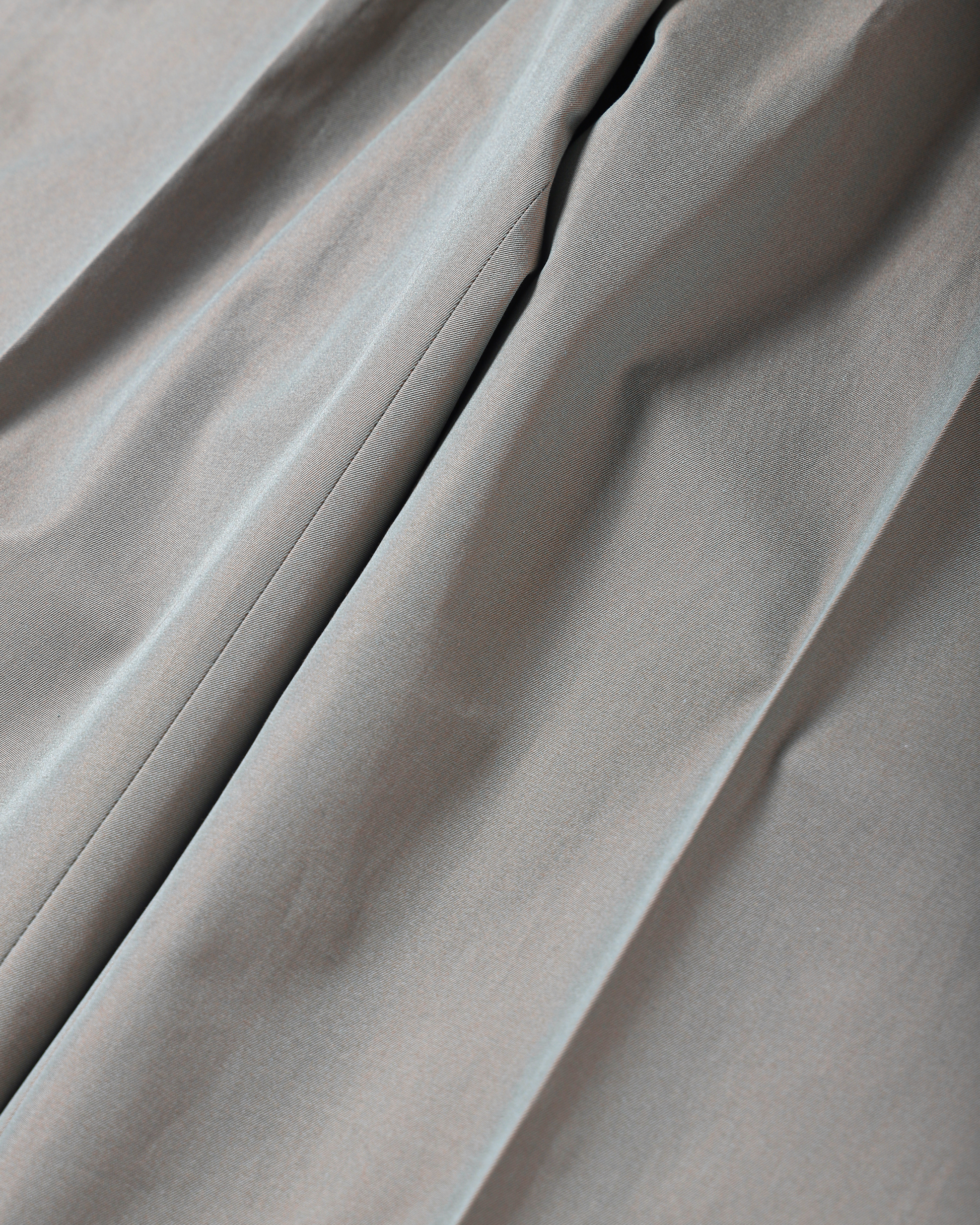 先染めされたオリーブ×オレンジの玉虫ギャバジン(ソラーロ)生地は光の角度や動きに合わせて豊かな表情を。