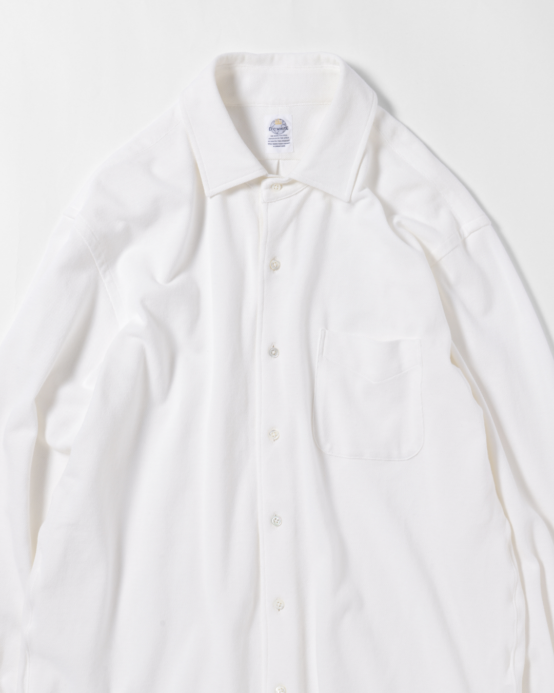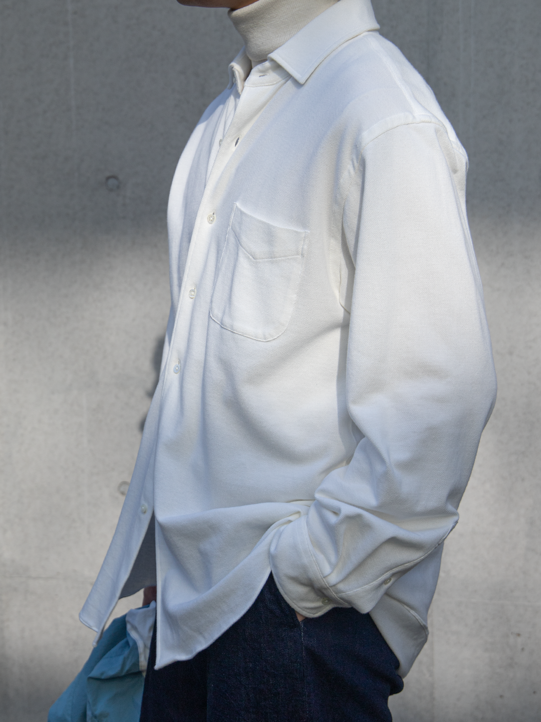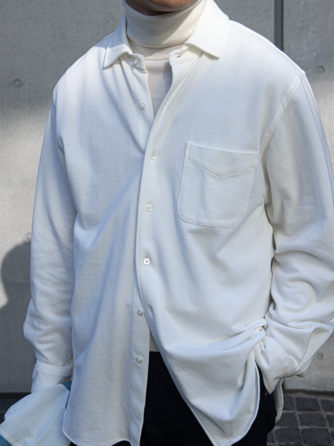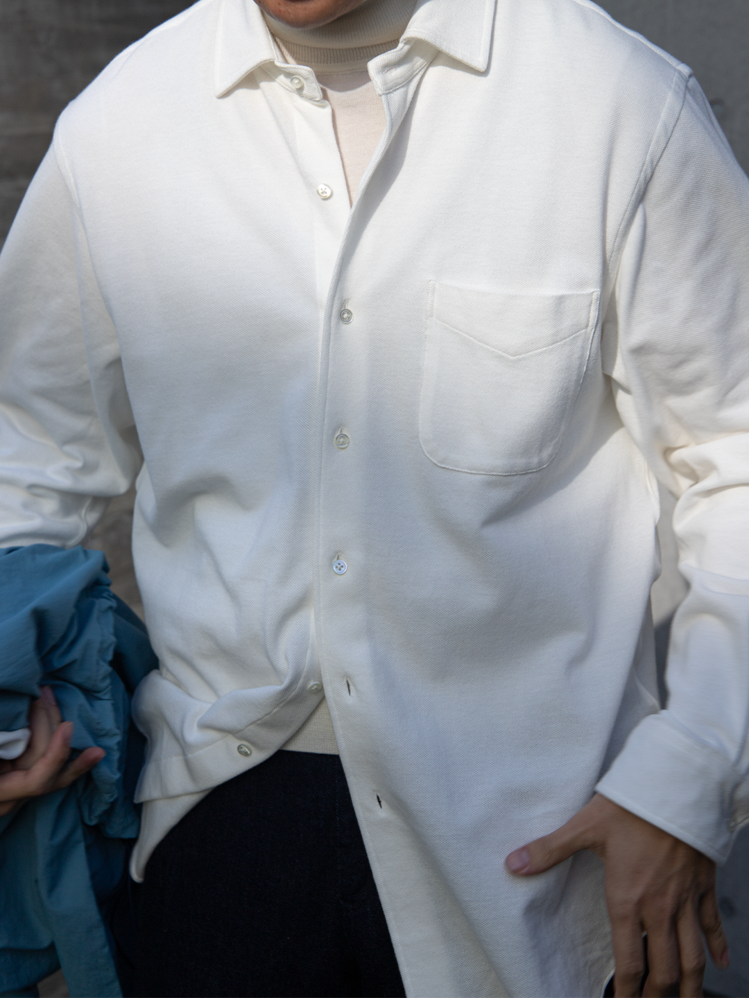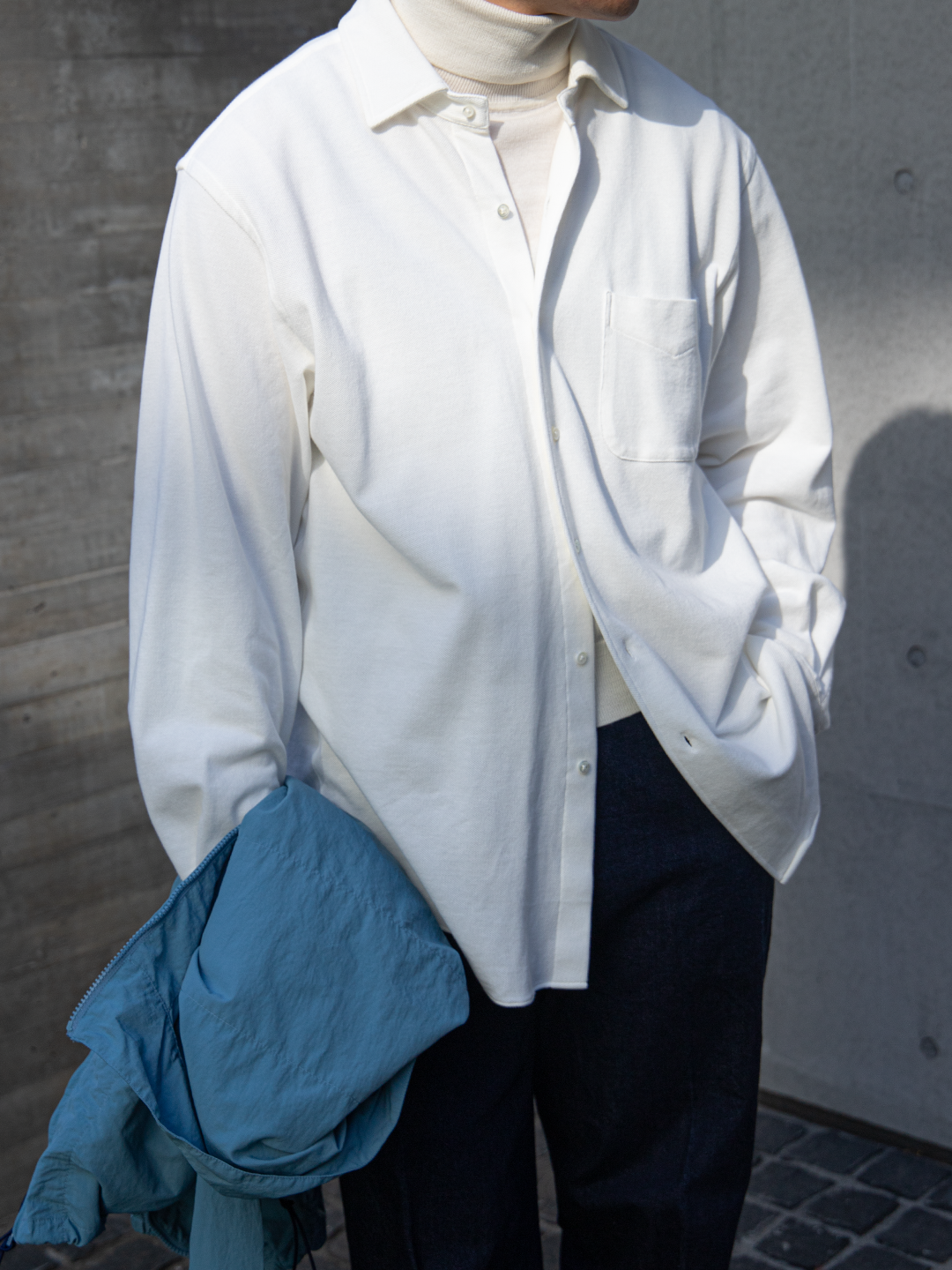 また、ややコンパクトなワイドスプレッドカラーが首元にほどよい開放感を与えながらもミニマルで都会的な印象を際立たせ、リゾートスタイルにも都会的なムードにもフィットする仕上がりに。
