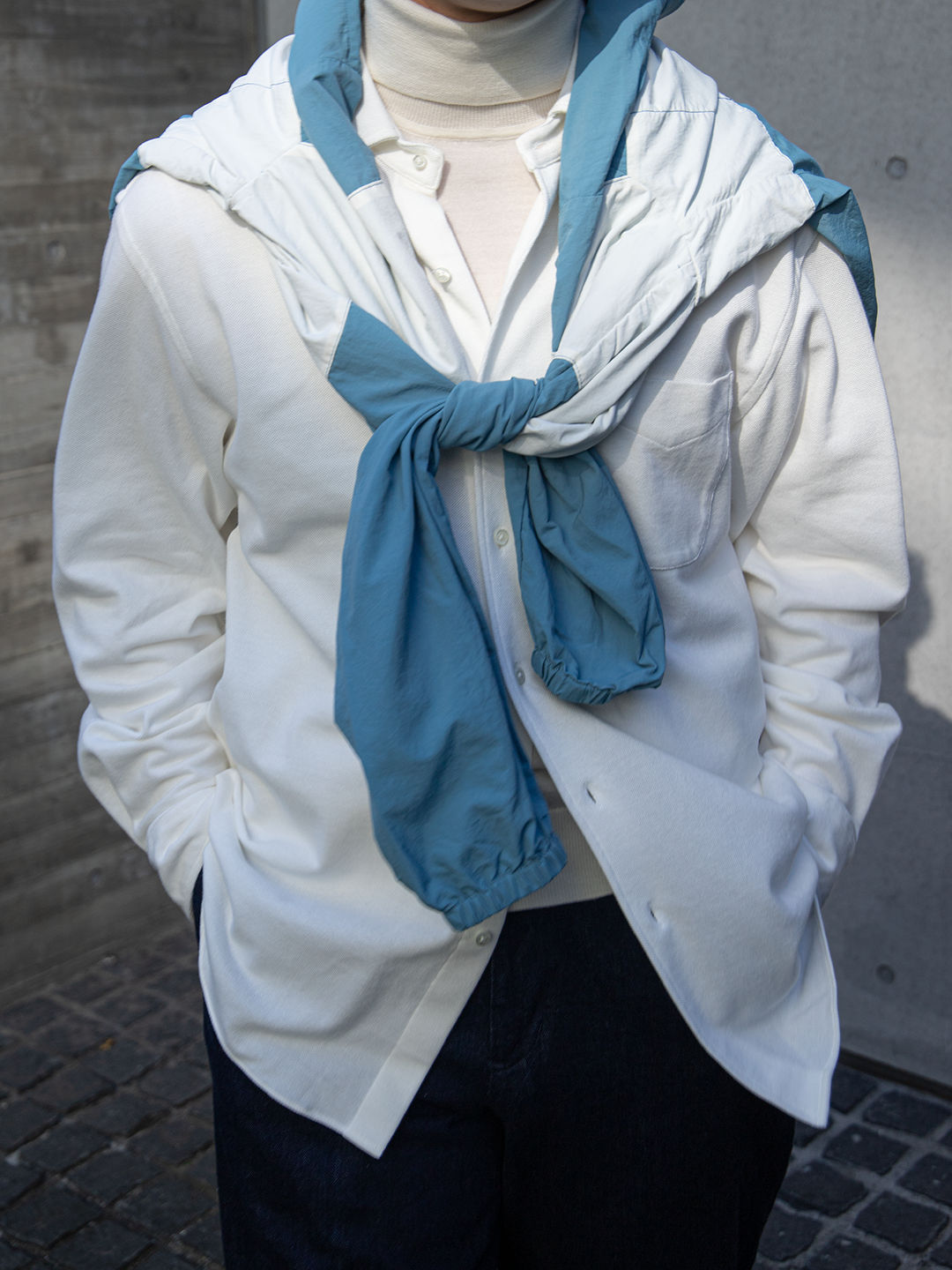 素材の特性により柔らかくたゆむようなVゾーンが自然と生まれ、襟元に軽やかさと色気を添えてくれます。