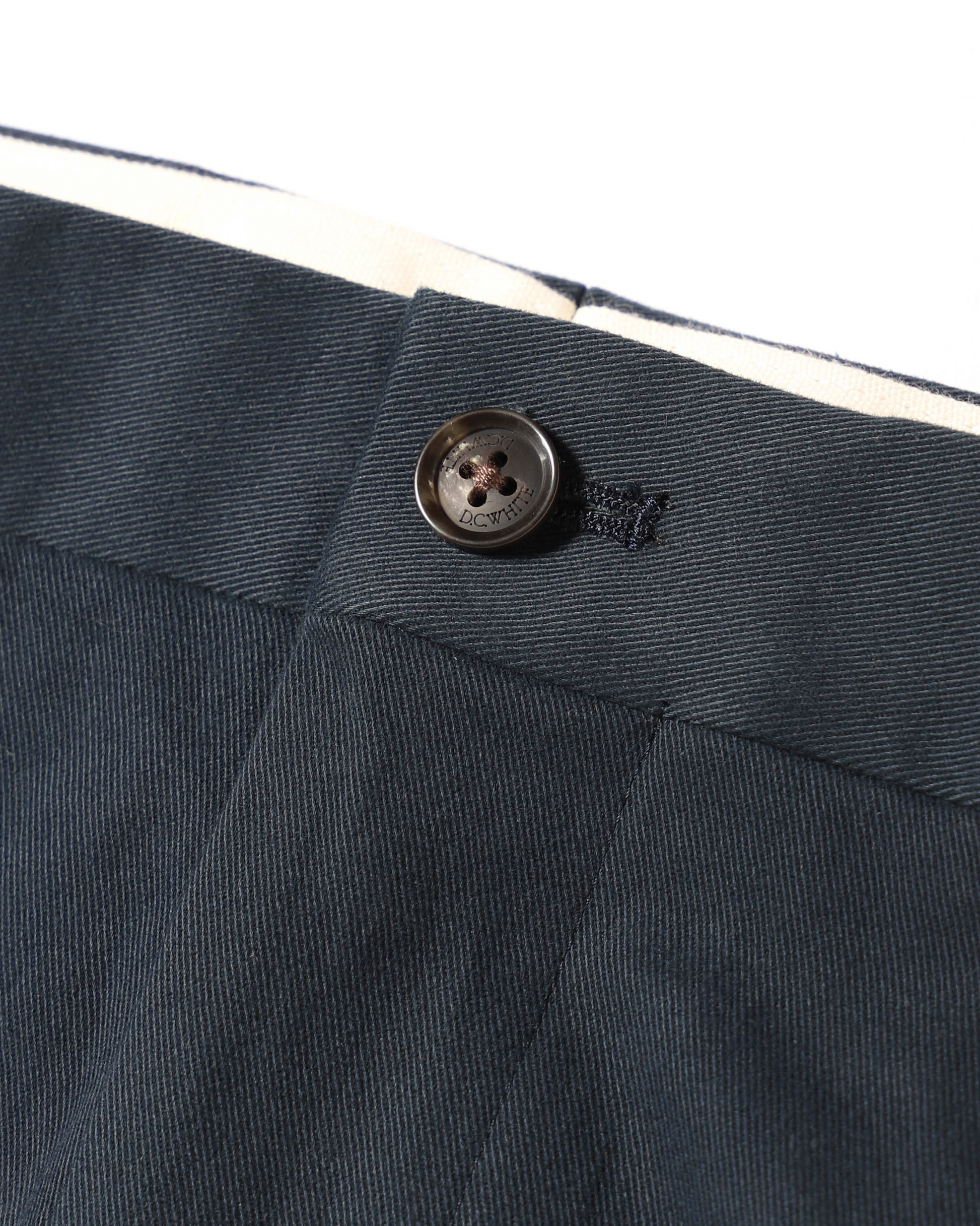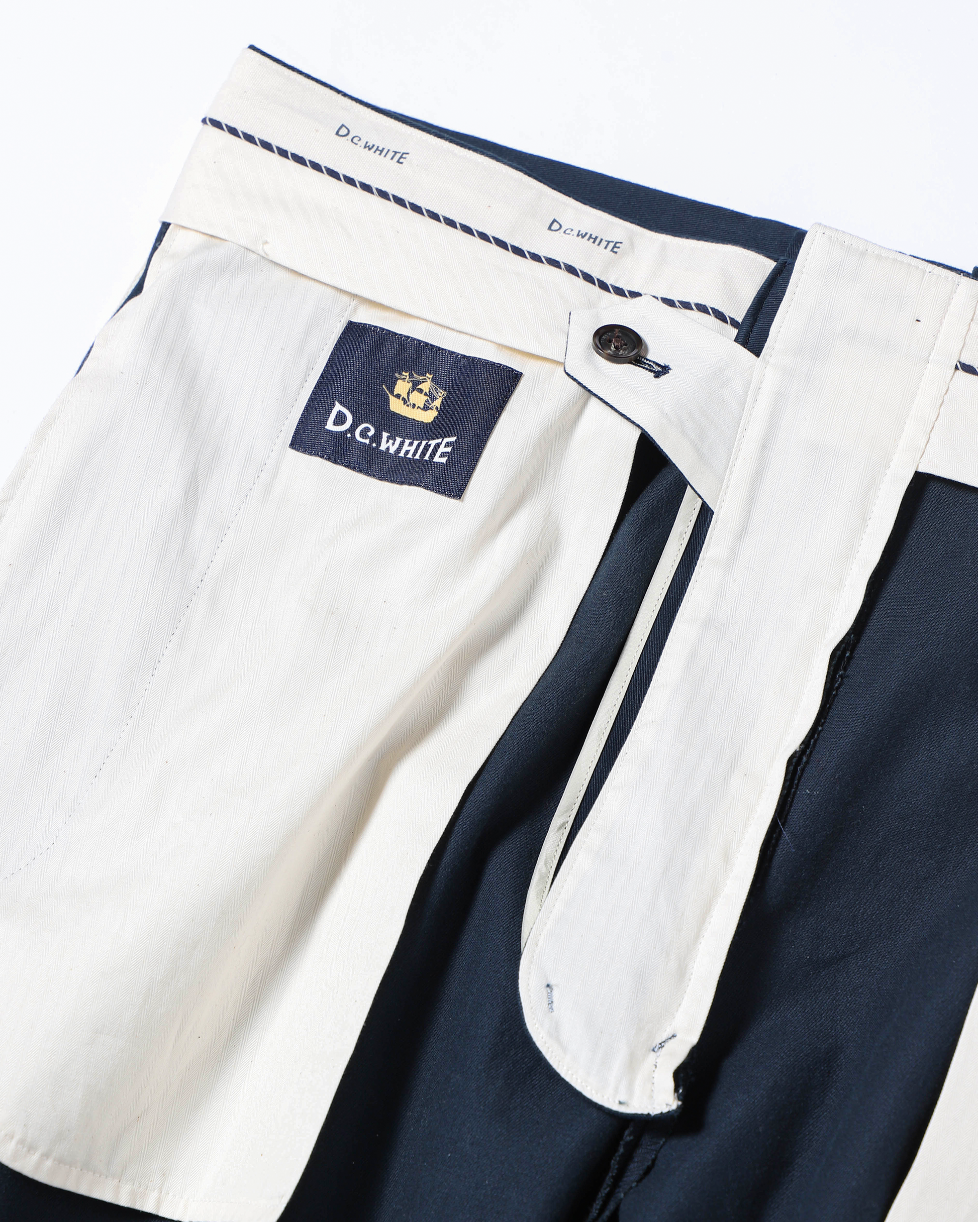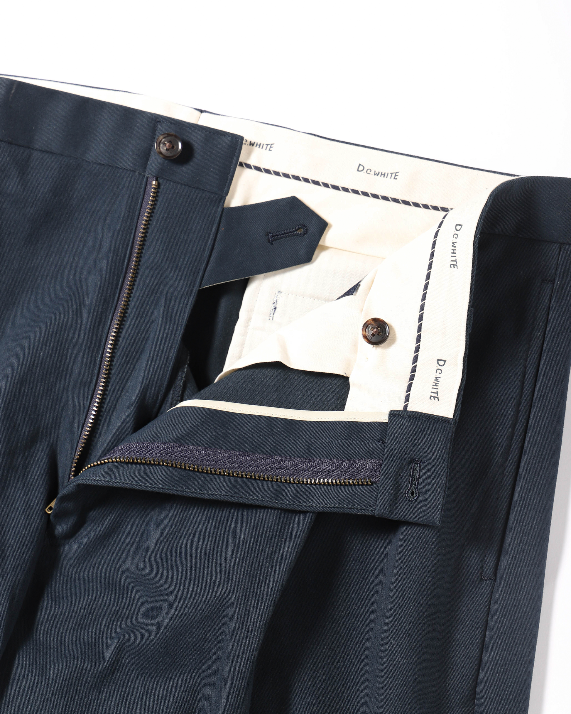 D.C.WHITEの新しい定番として完成したThe NAVYはカジュアルなチノパンでありながら、まるで上質なトラウザーのような雰囲気を持ち細部までD.C.WHITEのこだわりを宿しました。