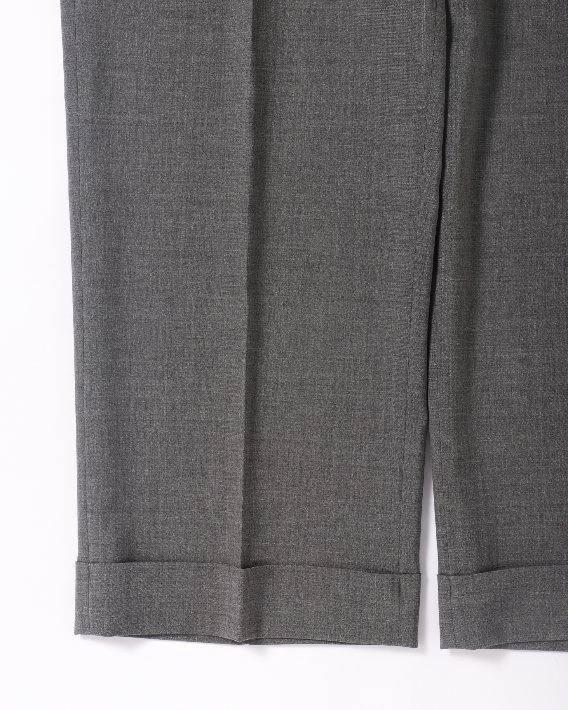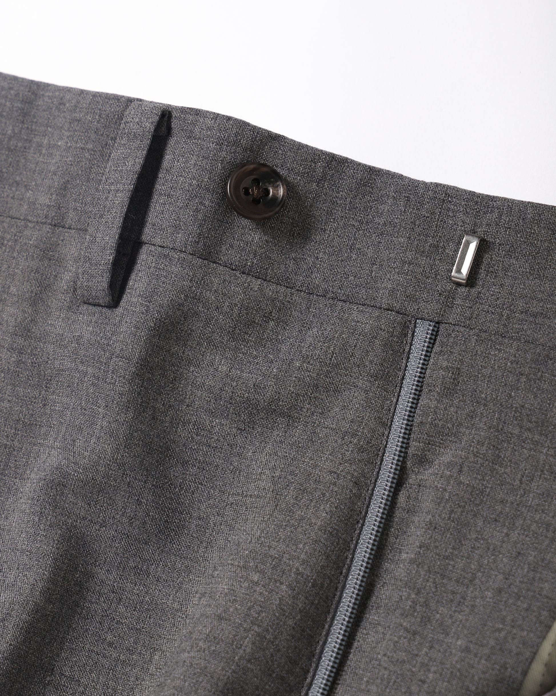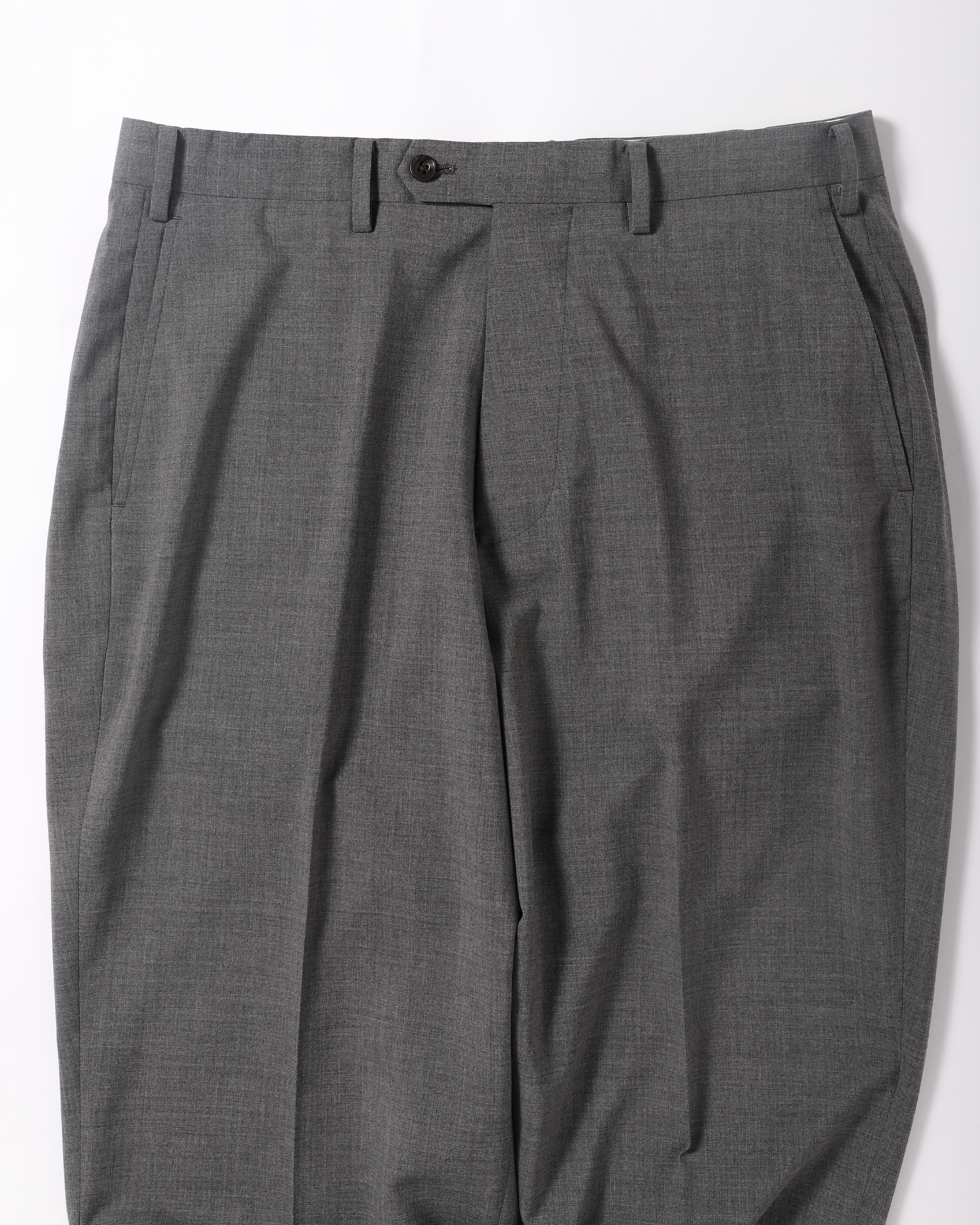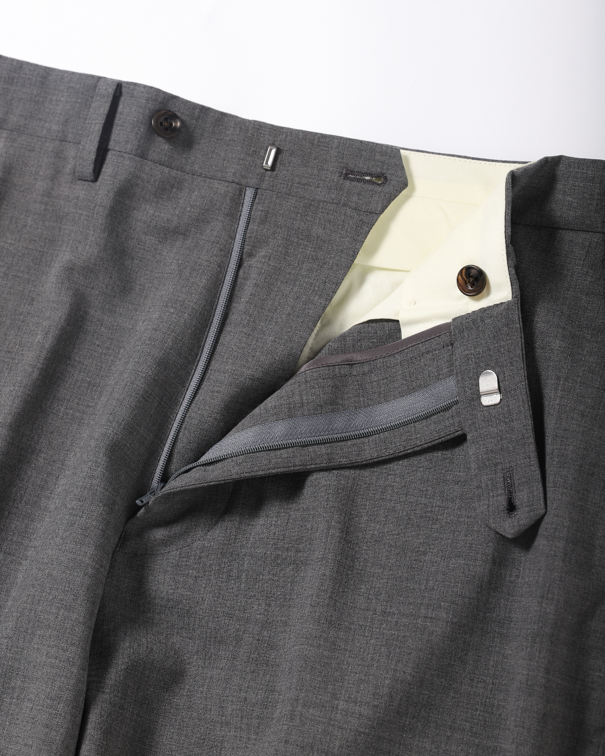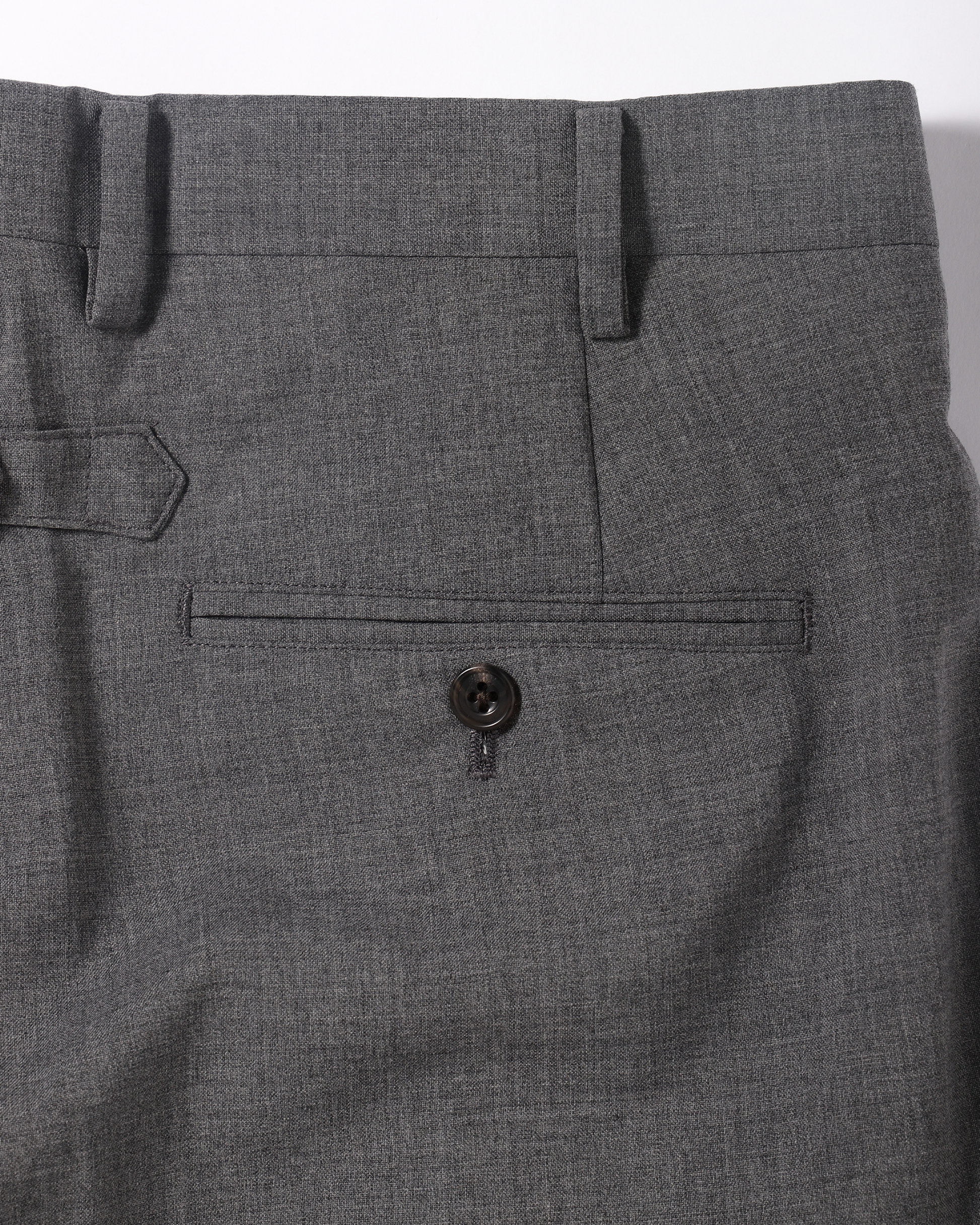 ポリエステル混紡のウールトロピカル素材は天然繊維の上品さと合成繊維の機能性を兼ね備え、手に取った瞬間からわかるドライなタッチ感、肌にまとった時の軽やかさ、そして汗ばむ季節でも快適さをキープする通気性と速乾性。