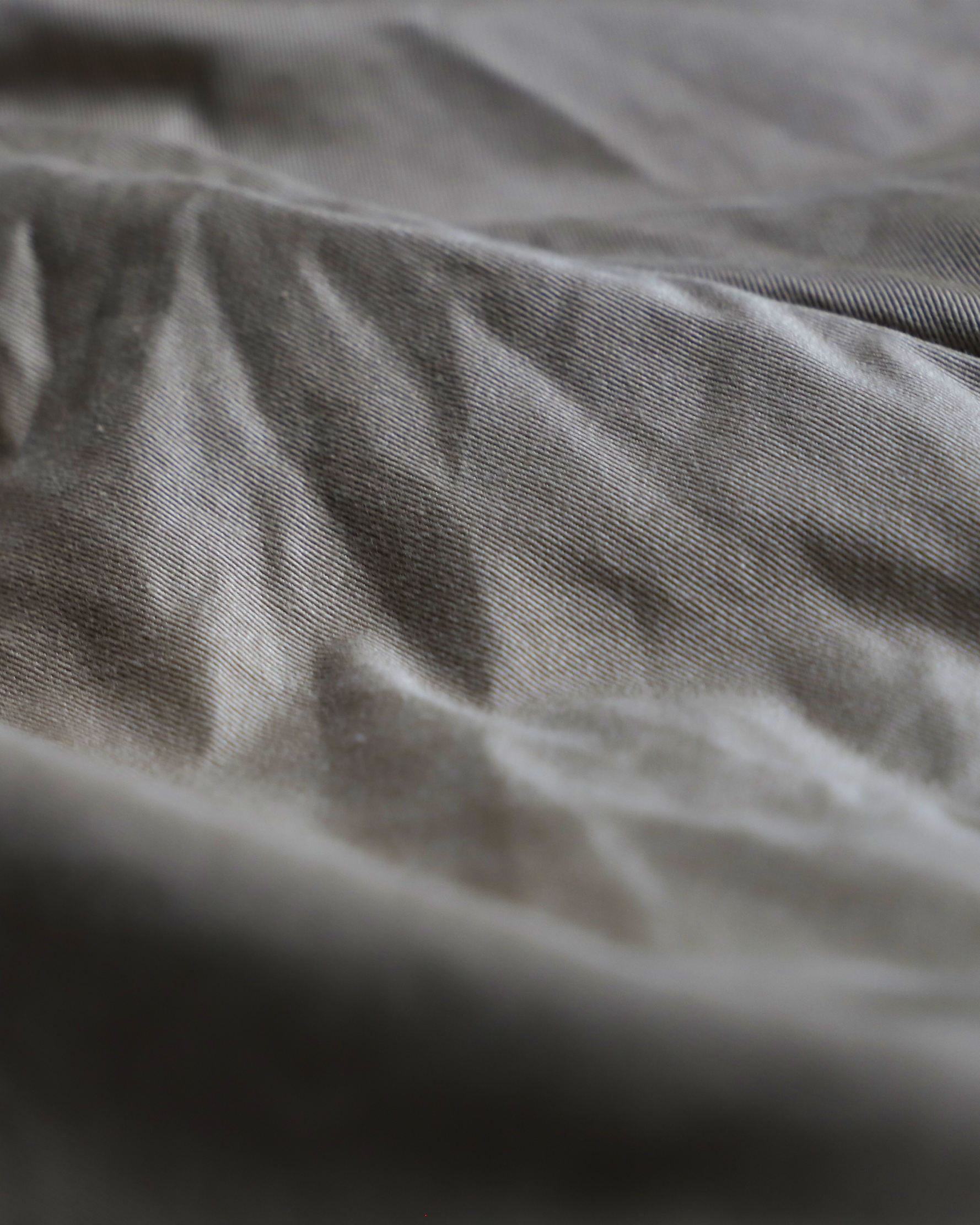 前述のような加工後も、ウエポン素材らしい控えめな光沢感は失っておらず、非常にカジュアルな仕様のパンツながら上品さは健在です。