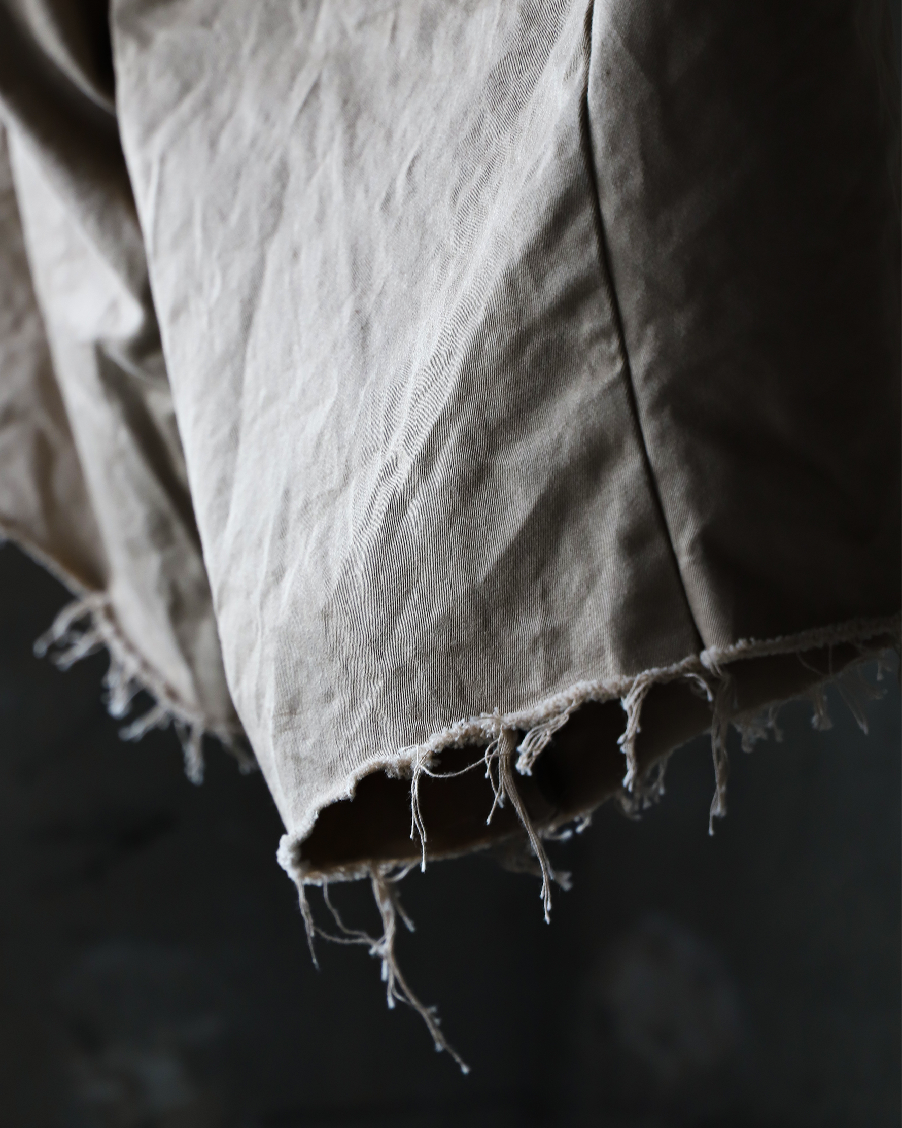 裾のフリンジとウエポン素材の独特なきめ細やかでありながら無骨な印象のシワ感を強調するため荒くウォッシュをかけた後天日干しをしております。